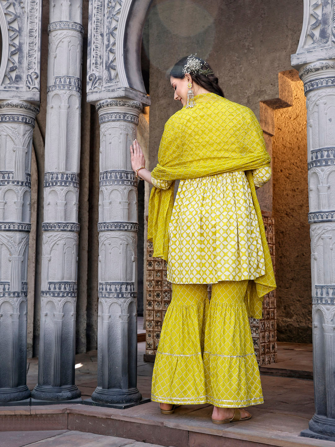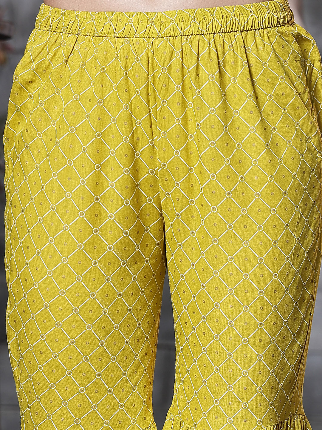 Yellow rayon geomatric print peplum kurta with printed sharara and printed dupatta set. Kurta has beautiful embroidery yoke with 3/4 sleeve,kurta bottom and sleeve and sharara bottom has gota detailing on it, with fully elasticated sharara and cotton printed dupatta. Kurta Length- 36" Inch, Pant Length - 38'' Inch, Dupatta Length - 2.30 mtr