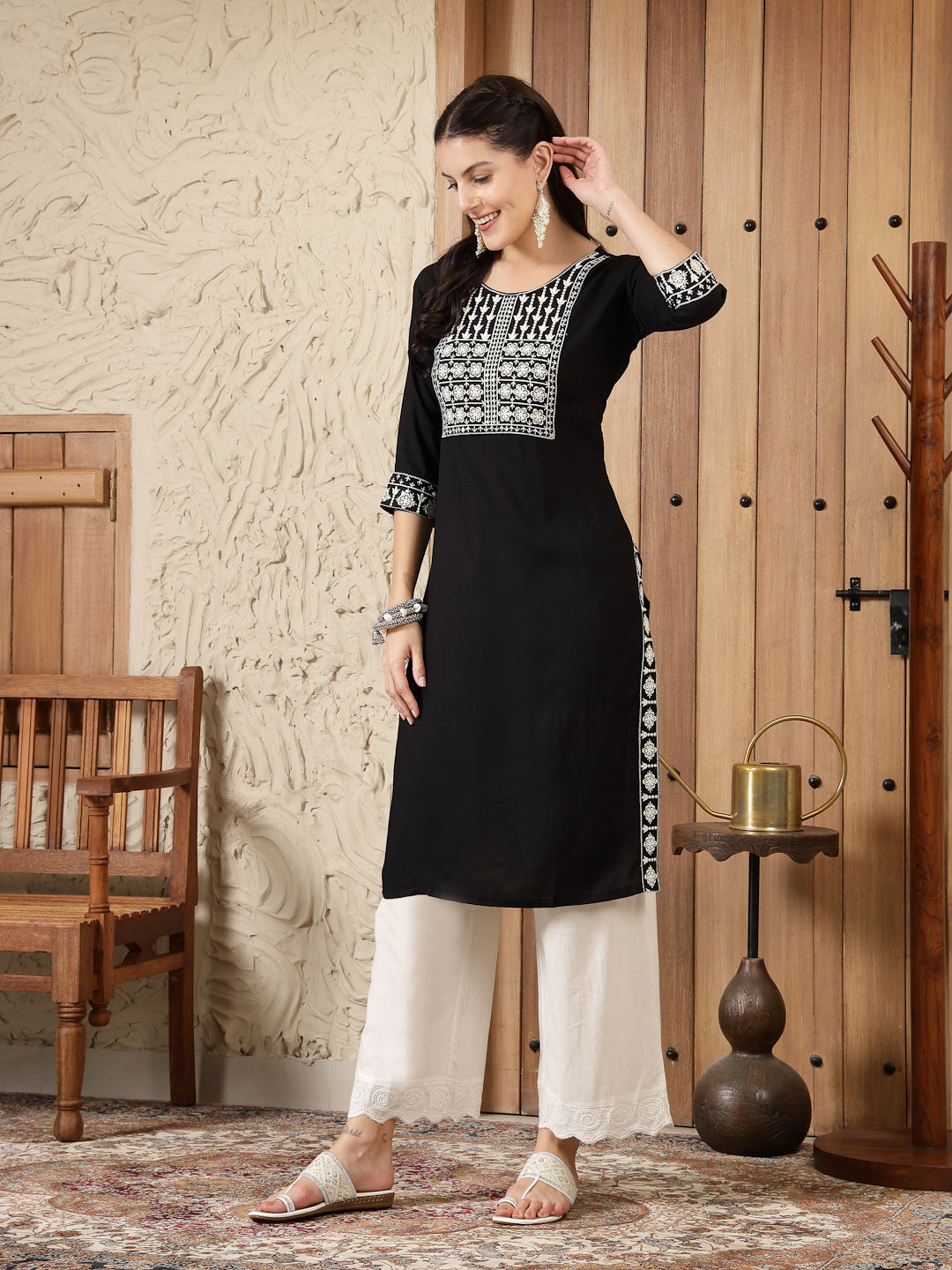 Festive black rayon round neck straight kurta. Kurta has beautiful embroidery on yoke, sleeve's and side slits . Kurta Length- 45''.