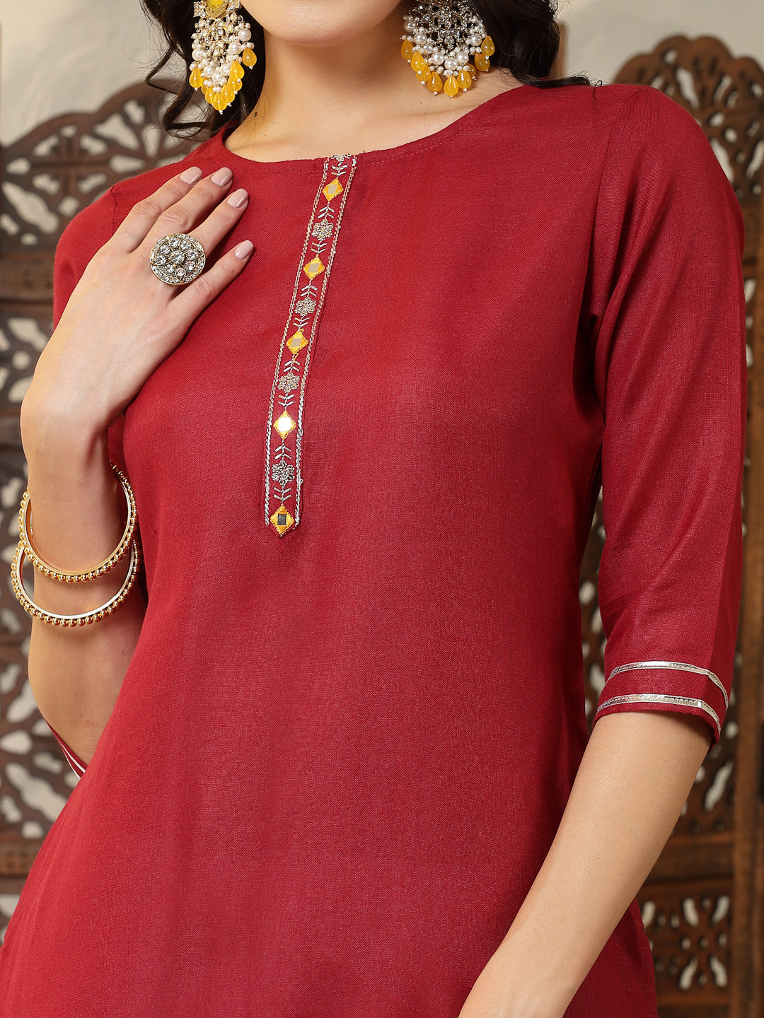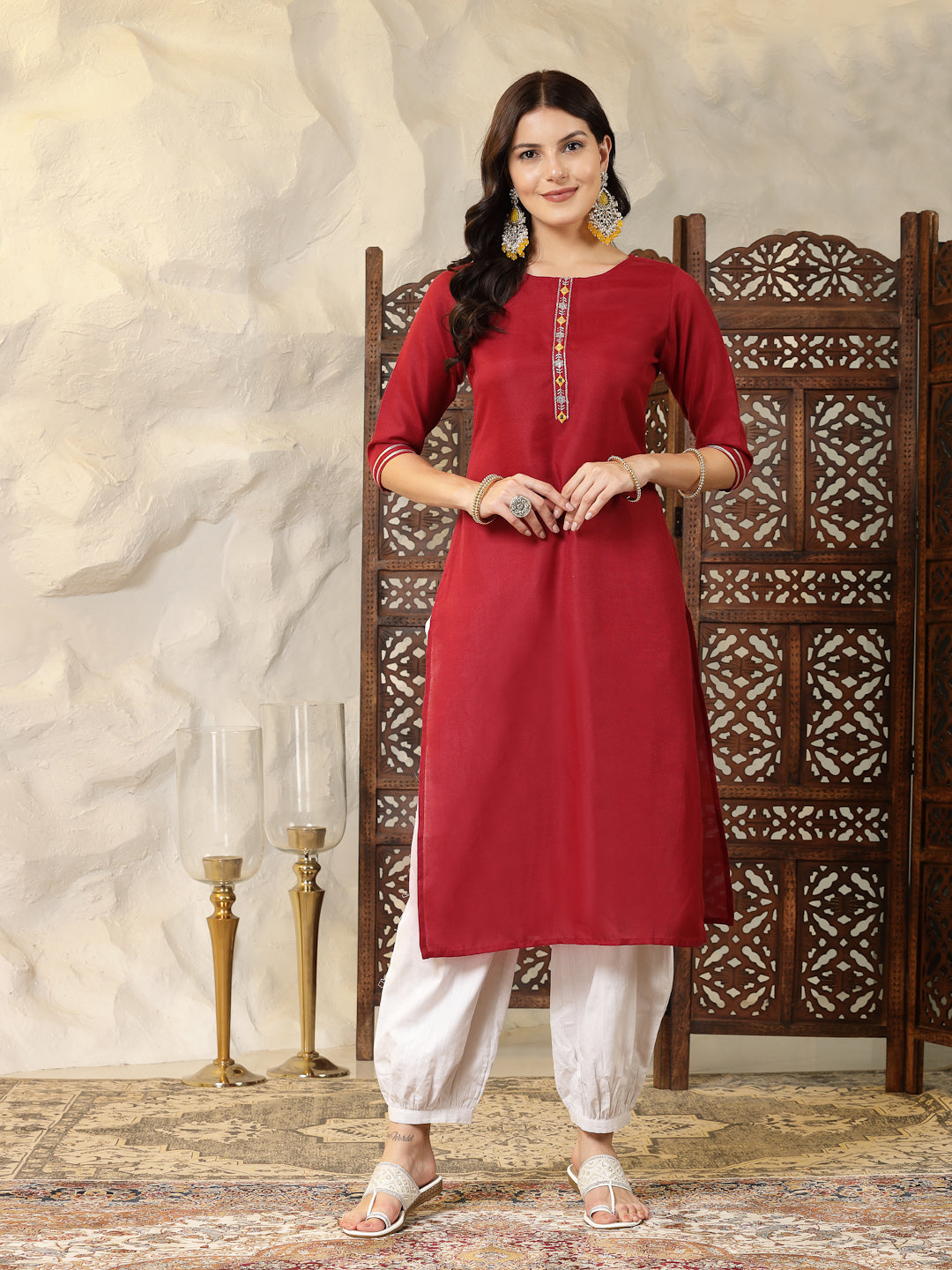 Maroon colour cotton blend straight kurta with round neck. It has embroidered front placket and 3/4 sleeves. Kurta Length -45" Inch. Casual to office wear kurta.