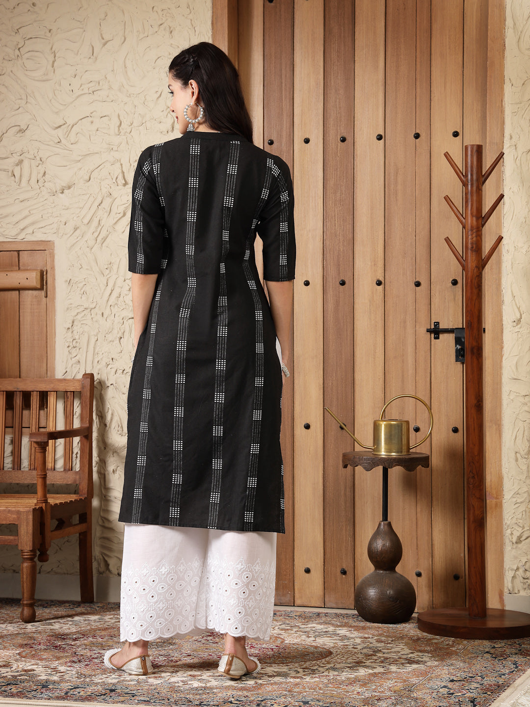 Black colour woven designed cotton blend straight kurta. It has mandarin collar and 3/4 sleeves. It is made of self designed embroidered fabric. Kurta Length -45" Inch. Casual to office wear kurta.
