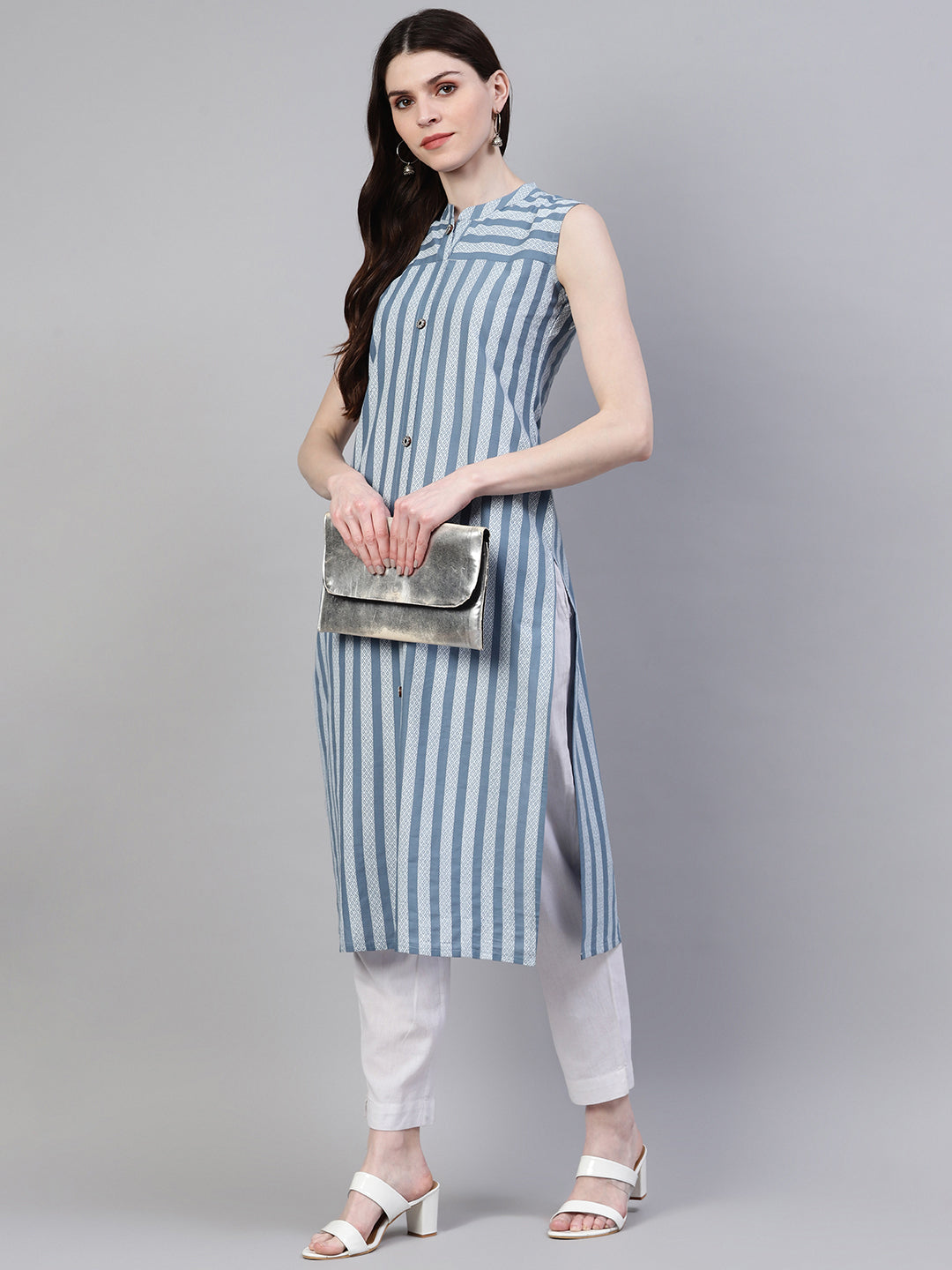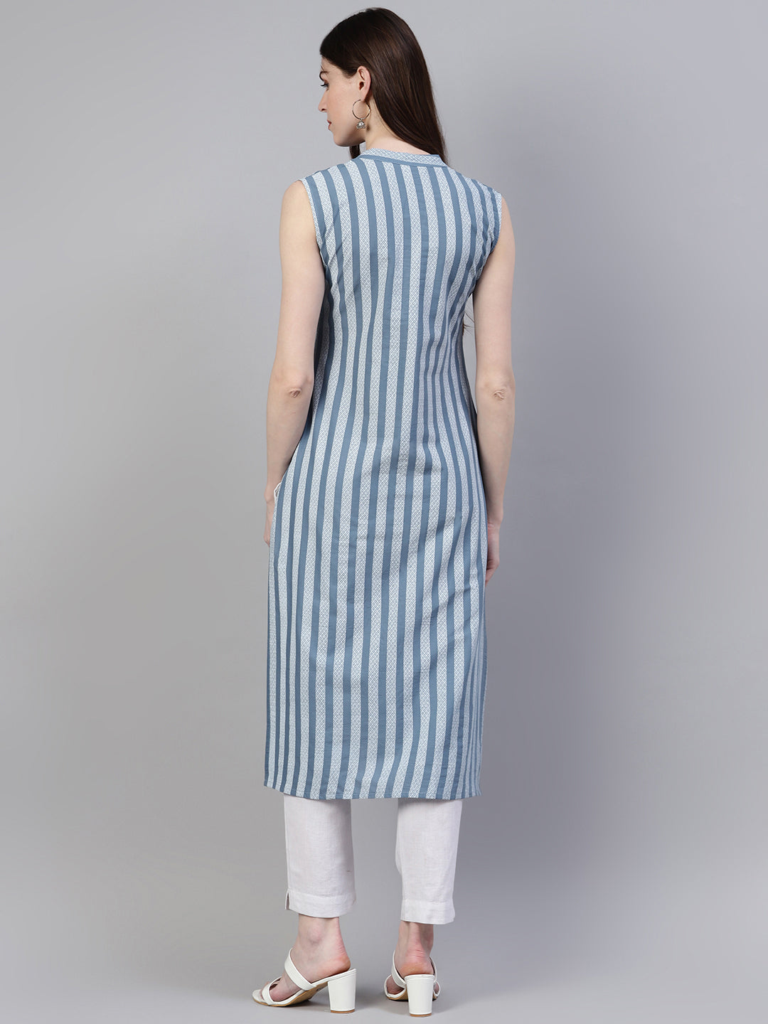 Stylum's soothing pastel grey kurta is all about winning over this hot summer. Comfortable sleeveless kurta is made of cotton fabric. Beautiful striped pattern makes this more desirable. This casual kurta can be used with contrast bottoms or denims. Products Length-45" Inch
