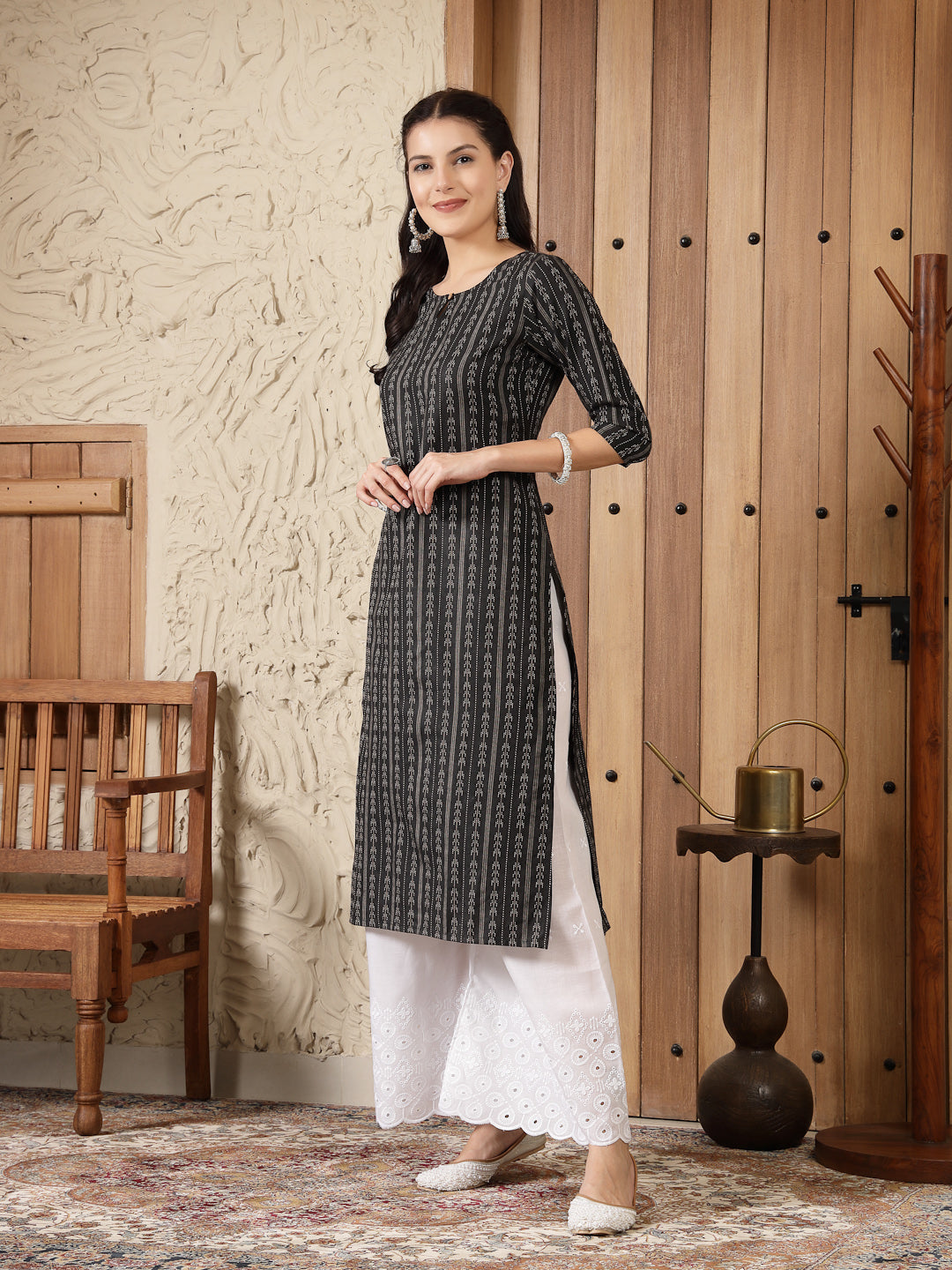 Black colour woven designed cotton blend straight kurta. It has round neck and 3/4 sleeves. It is made of self designed embroidered fabric. Kurta Length -45" Inch. Casual to office wear kurta.