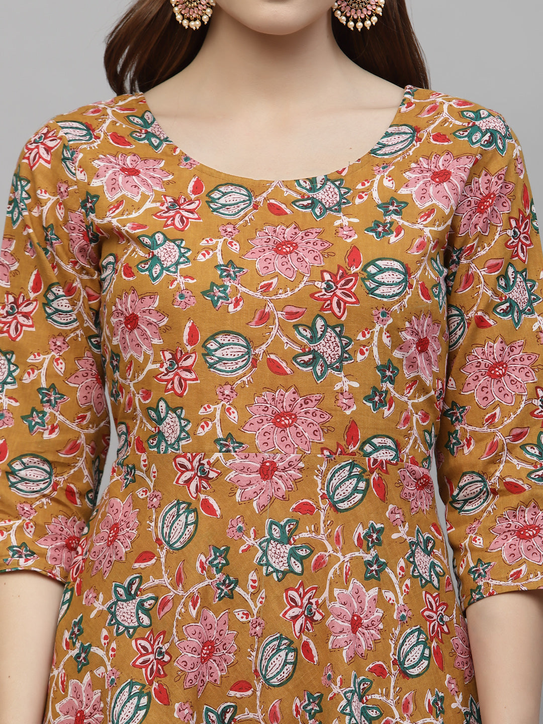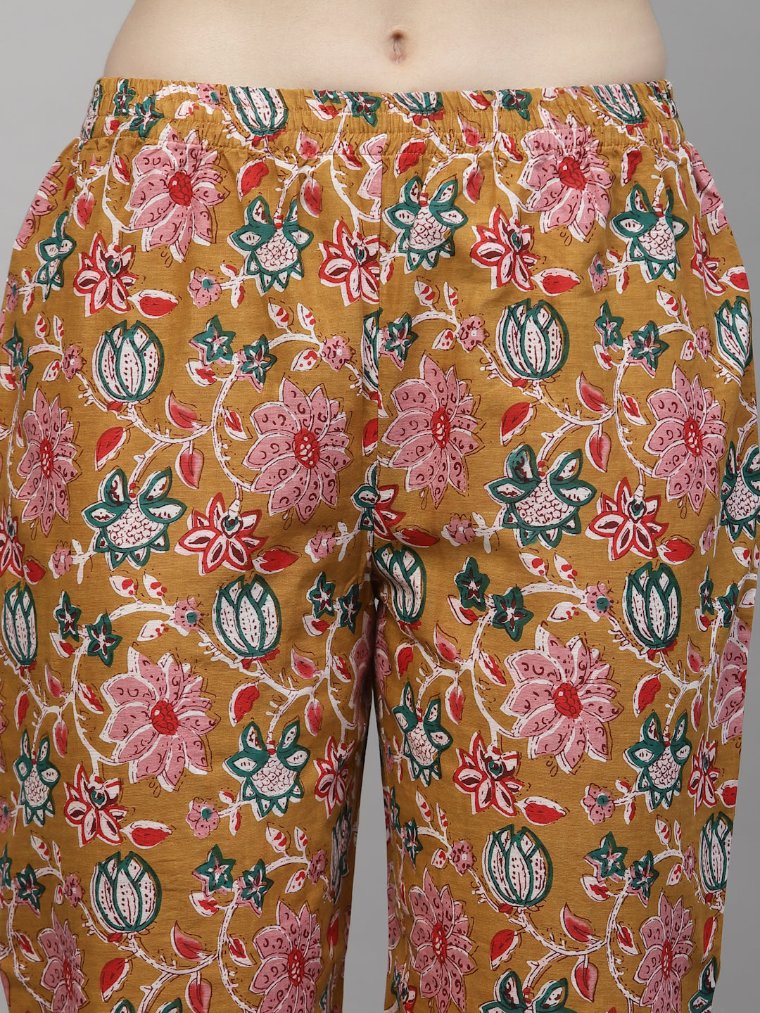 Our Floral Printed Cotton Kurta Pant Dupatta Set is a chic and stylish addition to your wardrobe. Made of high-quality cotton material, this cotton kurta set features a mustard yellow floral printed kurta with a charming back dori and tassels, adding a touch of elegance to your outfit. The accompanying printed pant has a full elasticated waistband, ensuring a comfortable and secure fit. To complete the look, the set also includes a beautifully printed voile dupatta, perfect for adding a pop of color and pattern to your ensemble. This versatile kurta set for women can be dressed up or down depending on the occasion. Pair it with some stunning jewellery and heels for a night out on the town, or keep it casual with sandals for a relaxed daytime look