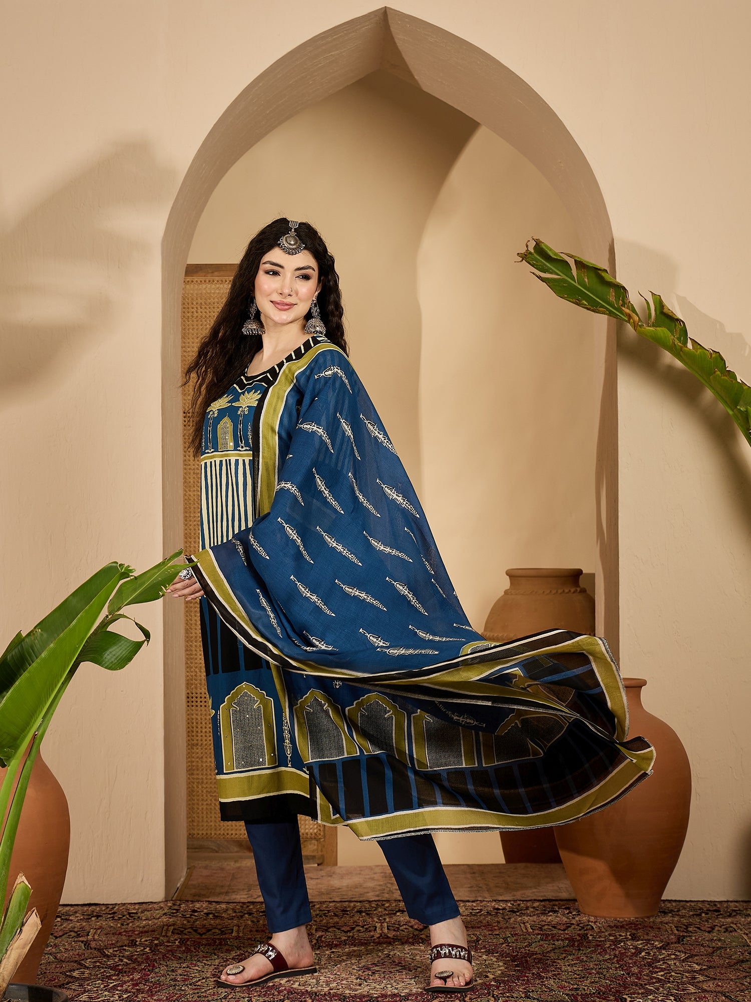 Blue cotton striped printed straight kurta pant dupatta set. Kurta has round neck with sequinned work on it and regular sleeve's. Cotton solid pant has fully elasticated waist belt. Paired with cotton printed dupatta. Kurta Length- 45'' Inch, Pant Length- 38'' Inch, Dupatta Length- 2.30 Mtr.
