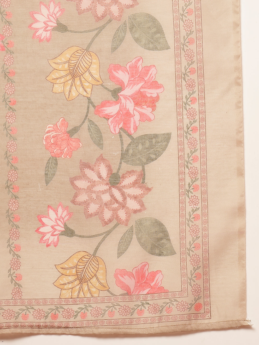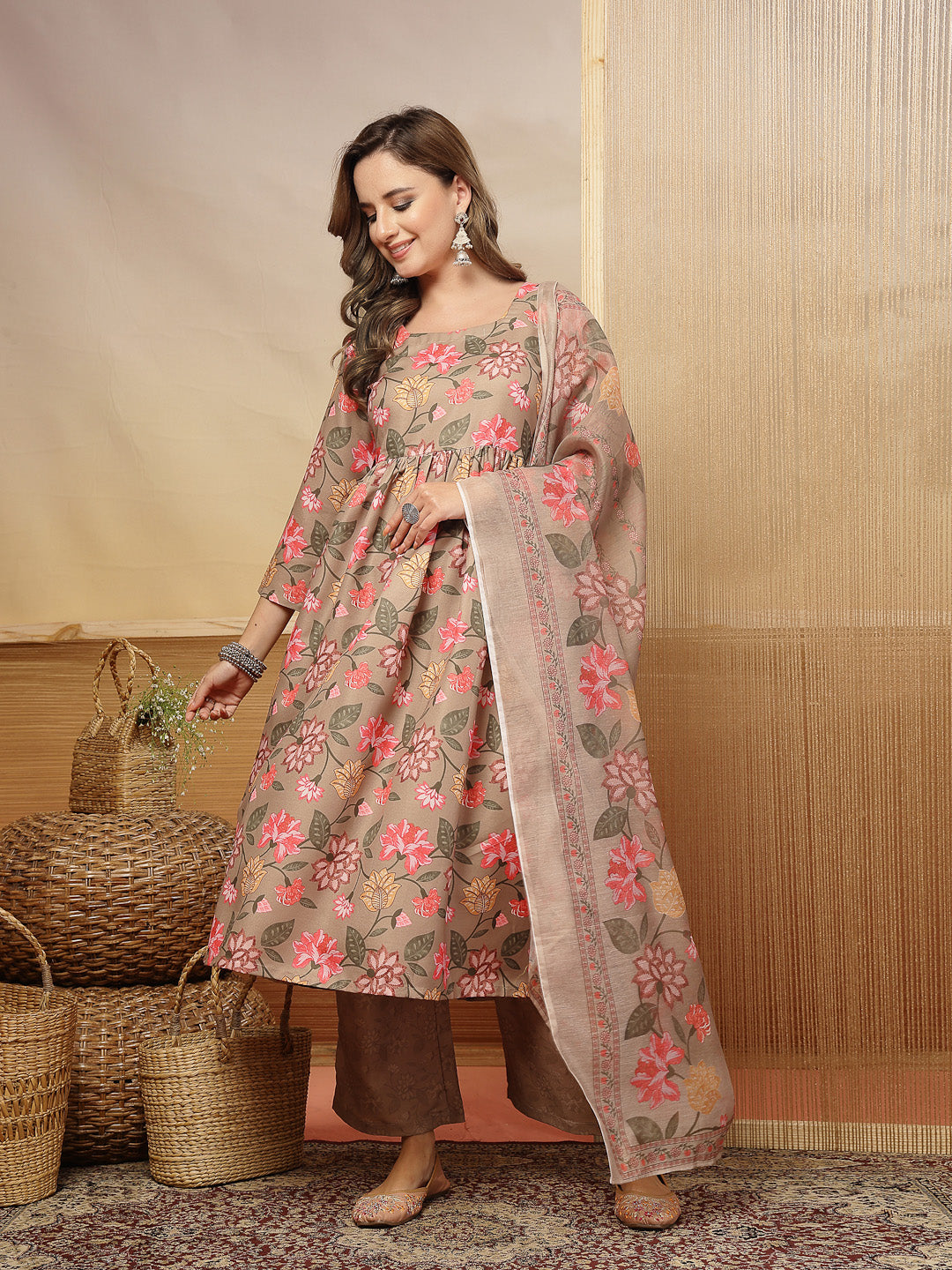 Brown floral printed rayon anarkali kurta pant dupatta set. Kurta has square neck and back side piping- fab tassels / gathers-plaeted detail on it, 3/4th regular sleeves. Brown printed pant has fully elasticated waistband. Paired with brown printed chanderi dupatta. Kurta Length - 48'' Inch, Pant Length - 38'' Inch, Dupatta Length - 2.30 Mtr.