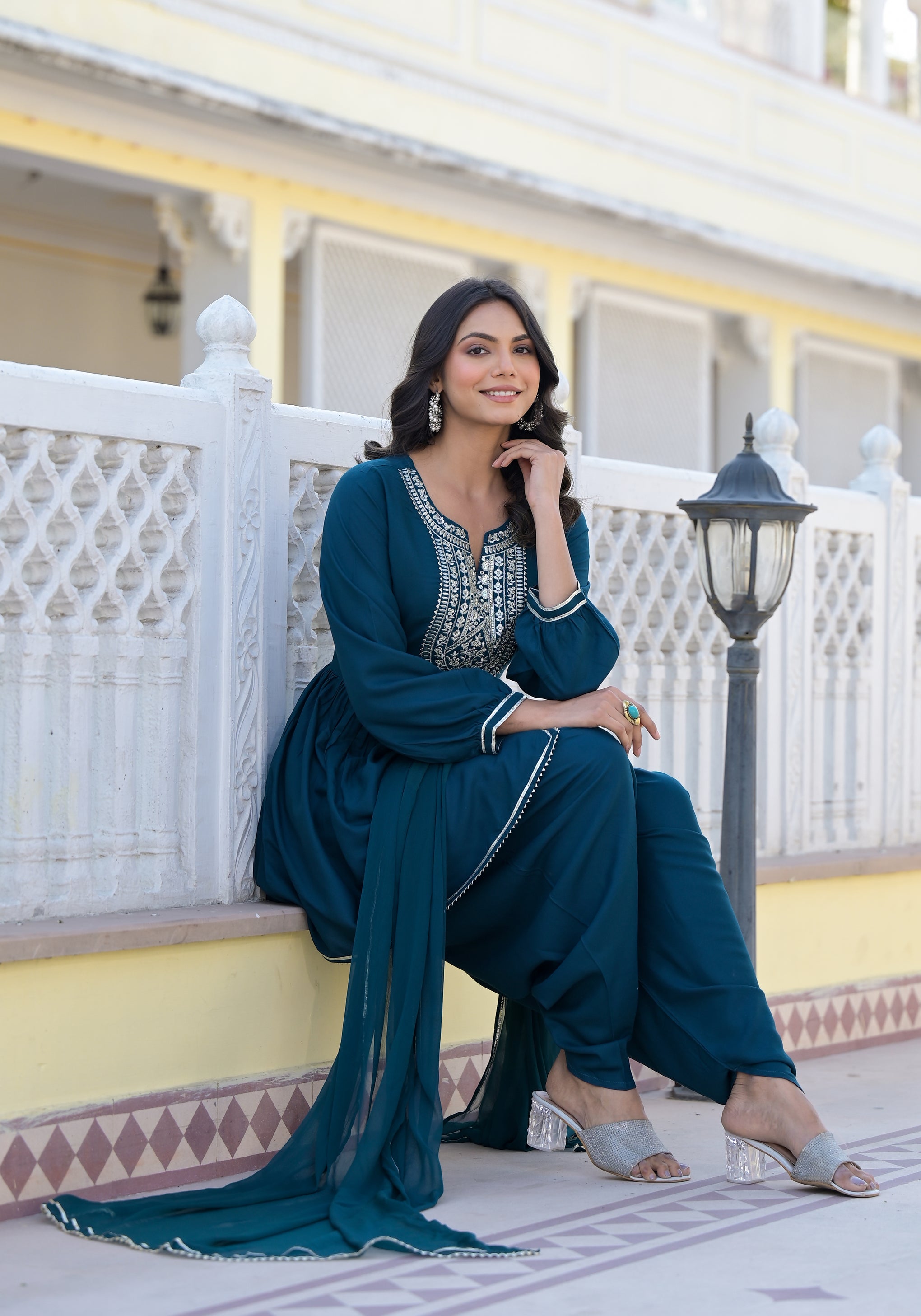 Solid teal kurta dhoti pant and dupatta set in Rayon fabric. Beautiful zari & mirror embroidery on neckline. Lace attached on front slit and sleeves. Solid dhoti has full elasticated waist. Solid chiffon dupatta with lace attached. Kurta Length- 34" Dhoti length - 39''. Dupatta length - 2.30 mtr. Festive wear outfit.