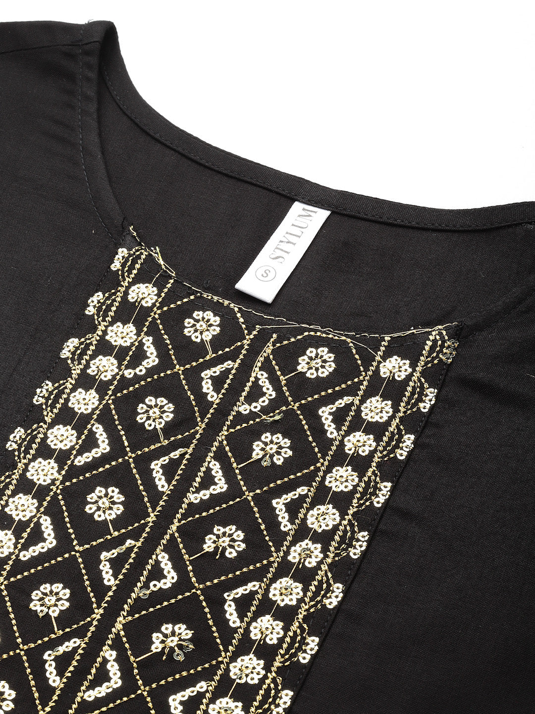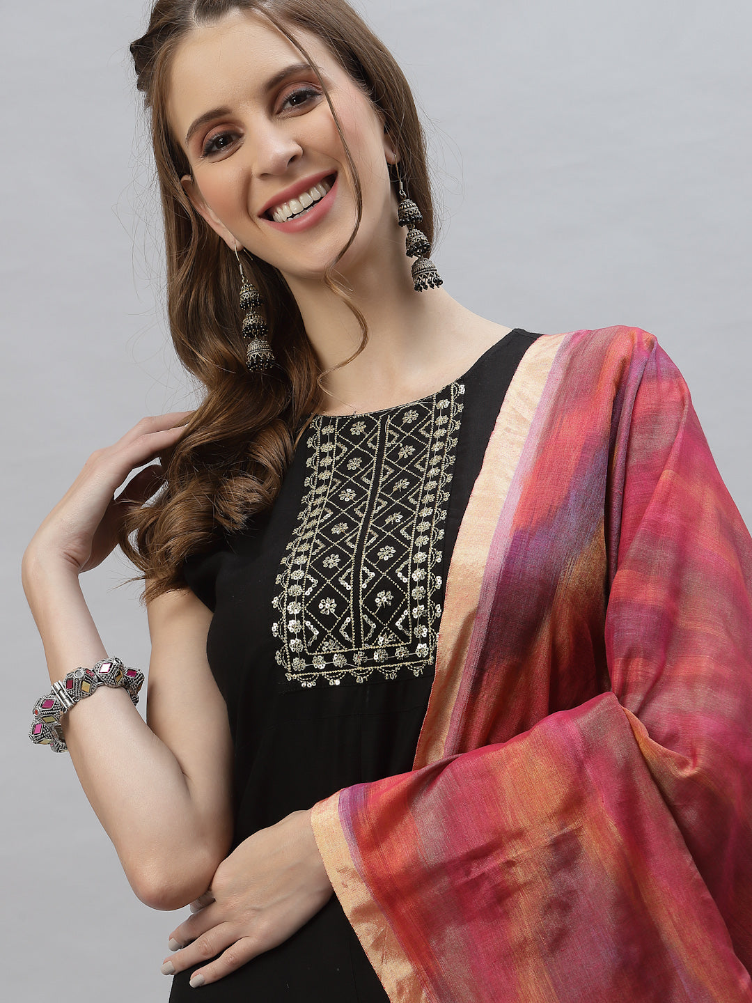 Rayon black solid embroidered flared kurta with round neckline, sleeveless kurta with beautiful shaded patola dupatta. Product kurta length-48" inch, dupatta length 2.30 mtr. Pair it with flared palazzo and ethnic earrings to complete the look.