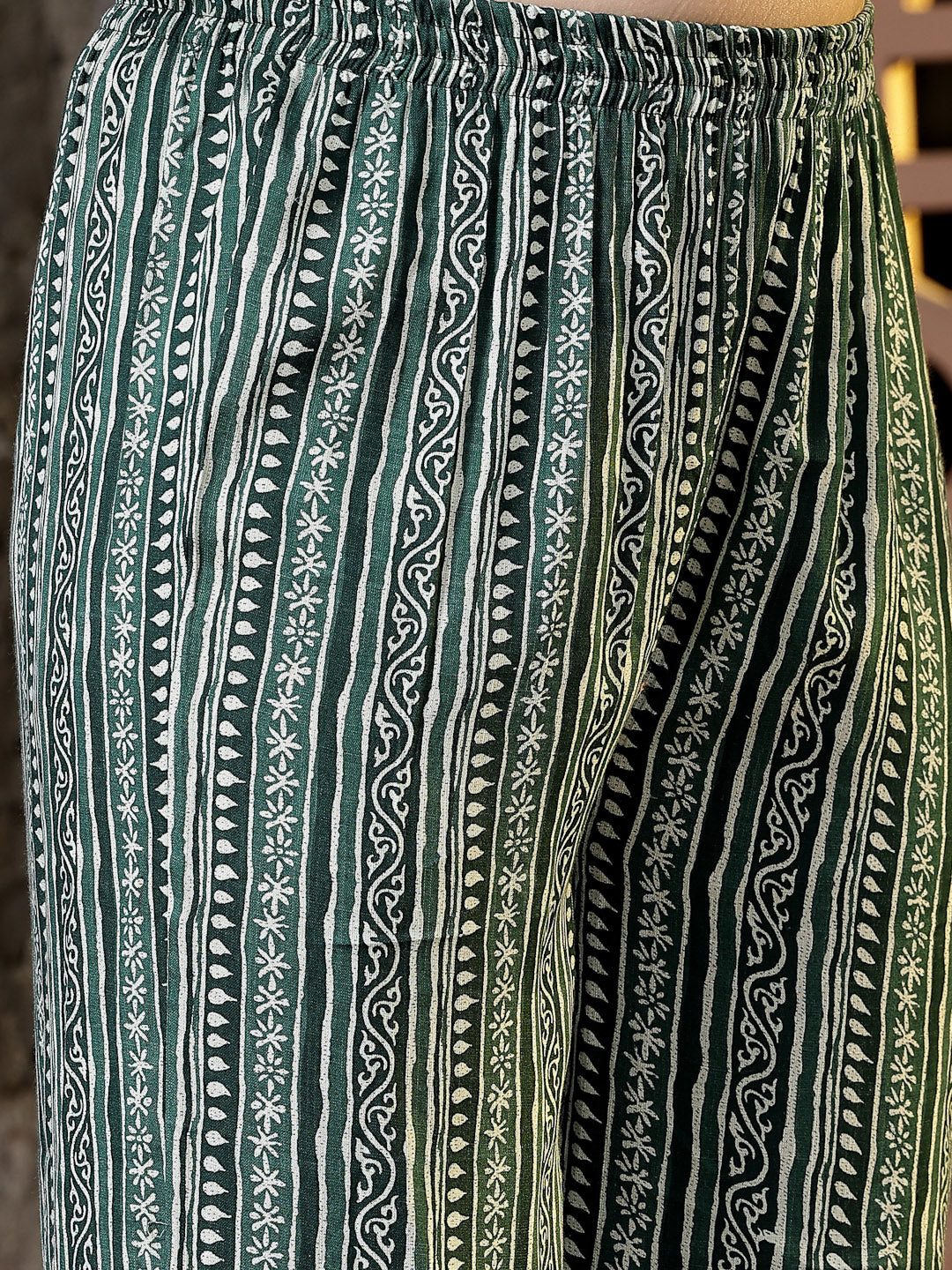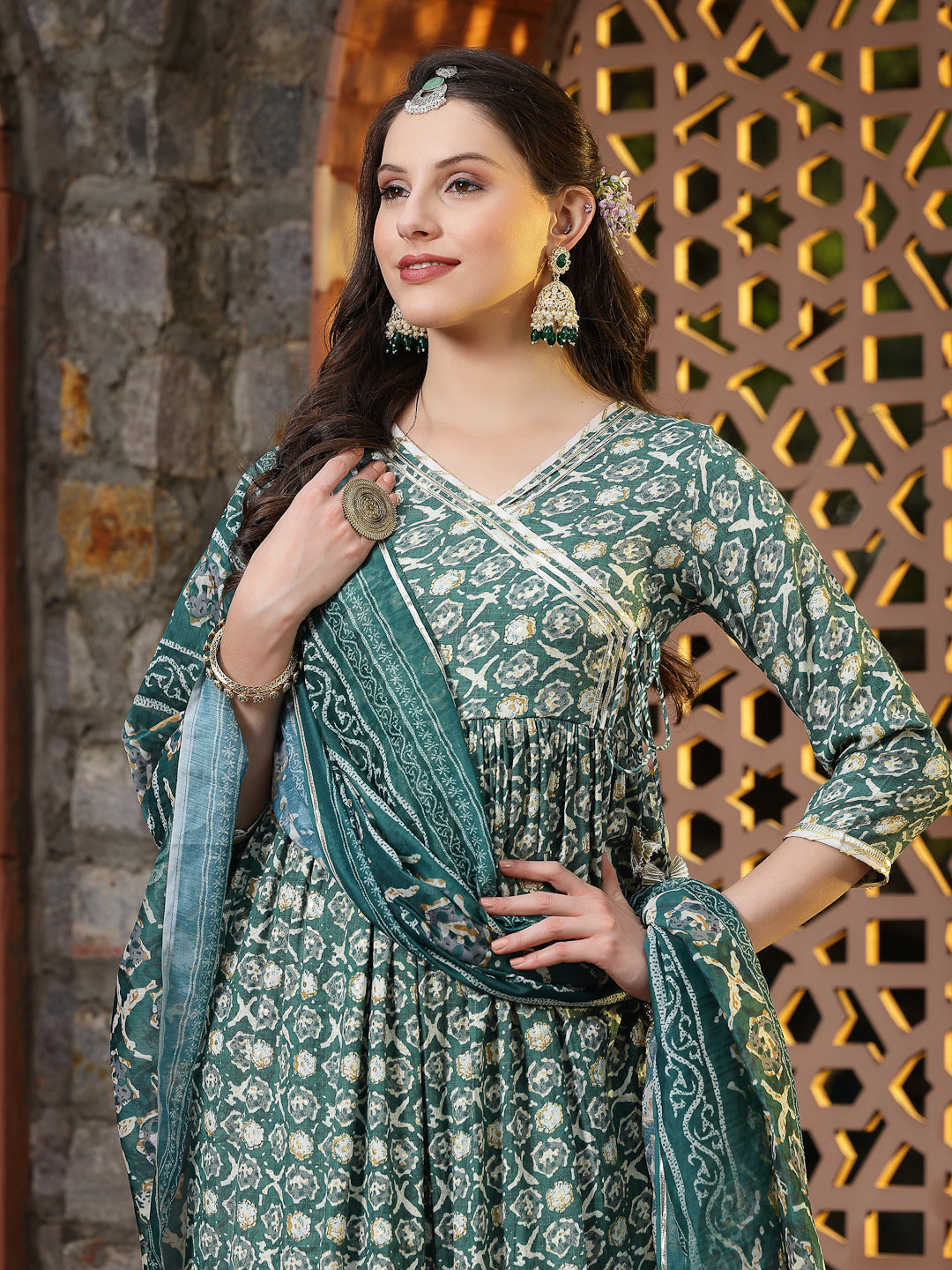 Green cotton blend floral print angrakha kurta with printed palazzo and dupatta set. Angrakha has beautiful gota & magji detailing and gota tassles on front with 3/4 sleeve, angrakha bottom and sleeve and palazzo bottom has gota & magji detailing on it with fully elasticated printed cotton blend palazzo and cotton blend printed dupatta, Kurta Length- 48" Inch, Palazzo Length - 38'' Inch, Dupatta Length - 2.30 mtr