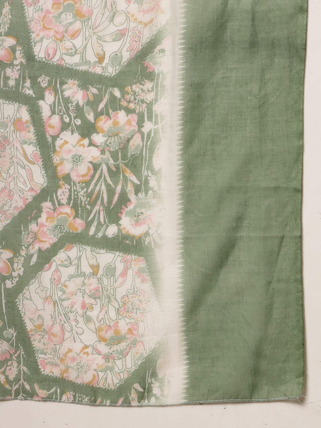Green floral printed cotton straight kurta pant dupatta set. Kurta has round neck with embroidery & lace on it and regular sleeves. Green cotton printed pant has fully elasticated waistband with one side pocket. Paired with mulmul printed dupatta. Kurta Length- 44'' Inch, Pant Length- 38'' Inch, Dupatta Length- 2.30 Mtr.