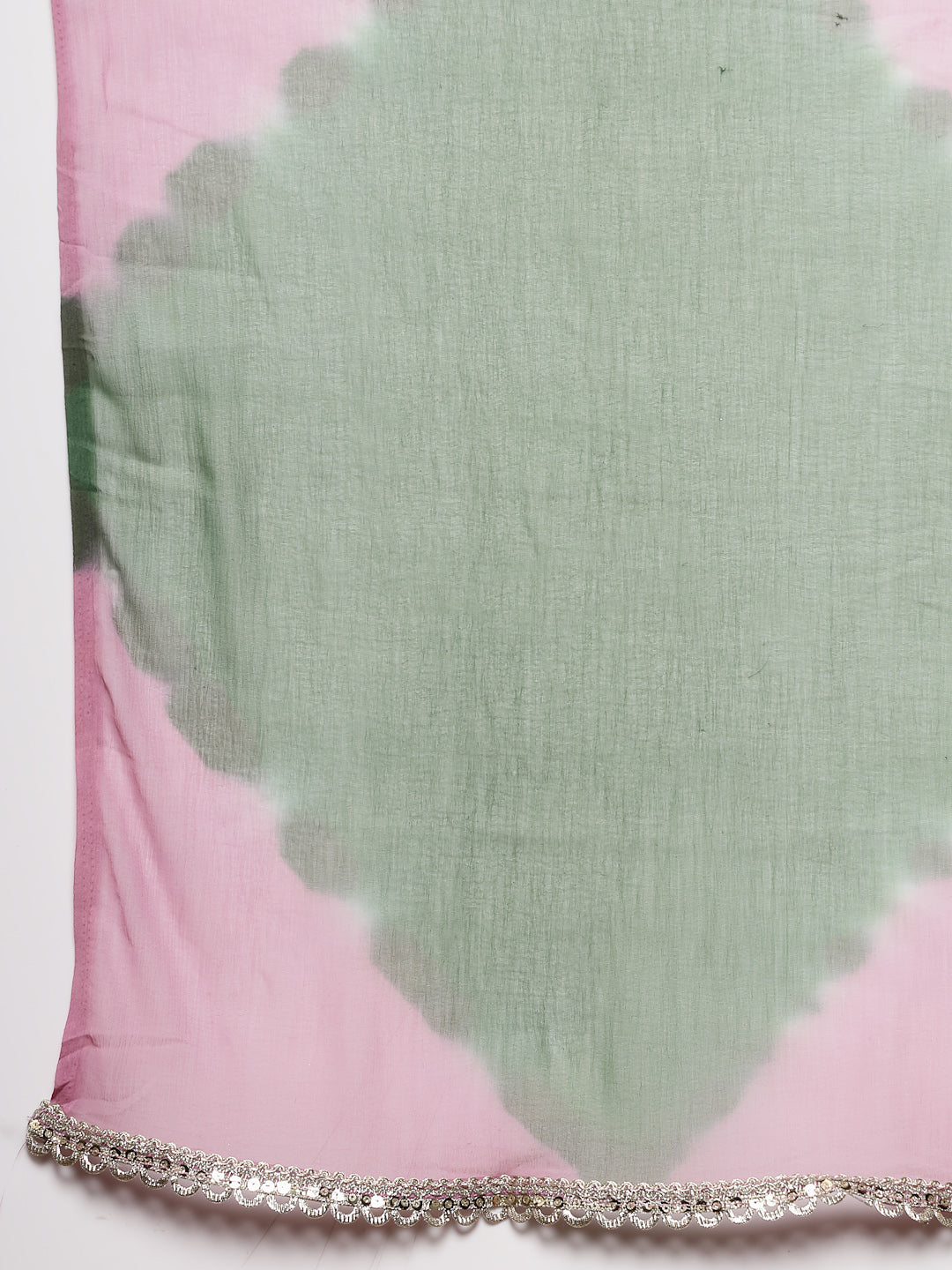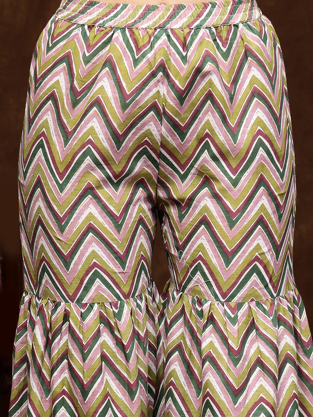 Green Katha Cotton Floral Printed Kurta Sharara Dupatta Set. Kurta has halter neck and sleevesless pattern. Sharara has fully elasticated waistbelt. Paired with chiffon tie & dye dupatta. Kurta Length - 34'' Inch, Sharara Length - 38'' Inch, Dupatta Length - 2.30 Mtr.ch.