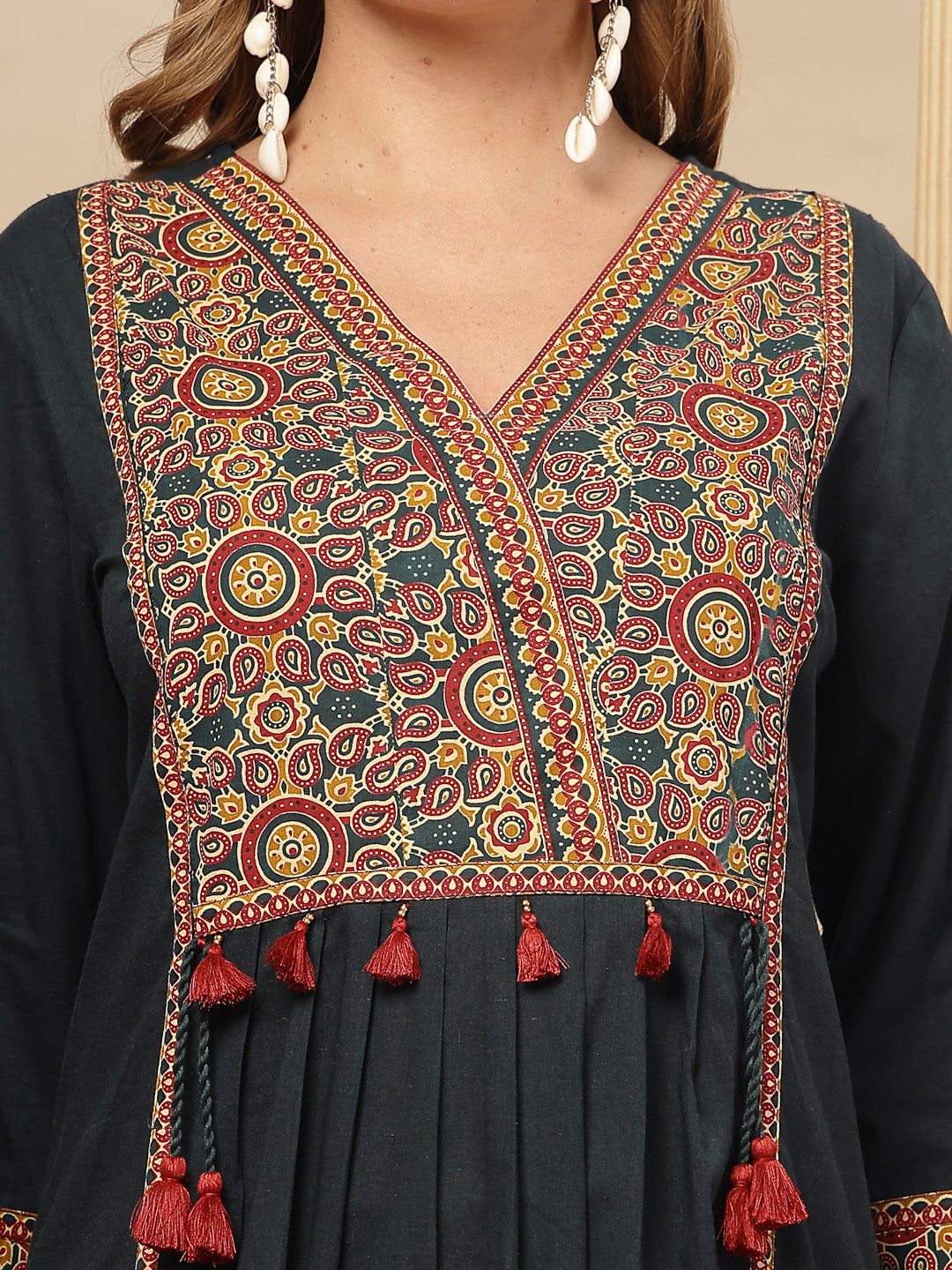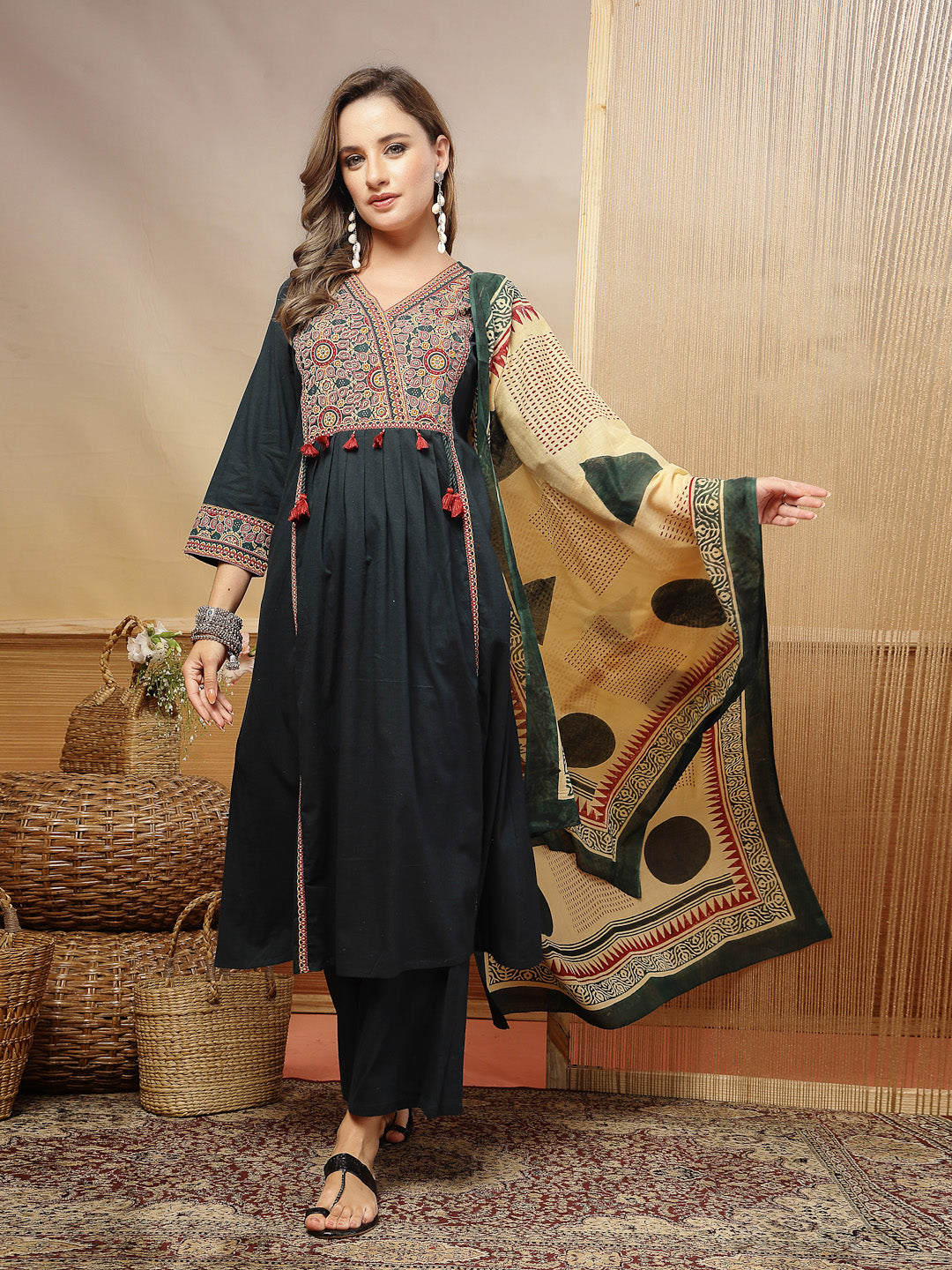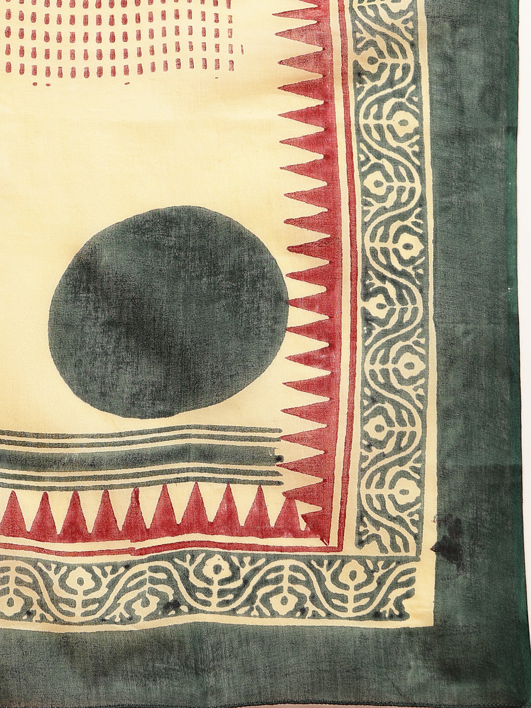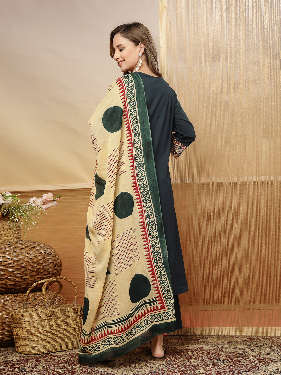 Green solid cotton straight kurta pant dupatta set. Kurta has v-neck with printed yoke and lace on front detail, 3/4th cuff sleeves. Green solid cotton pant has fully elasticated waistband. Paired with solid voile dupatta. Kurta Length-45'' Inch, Pant Length - 38'' Inch, Dupatta Length - 2.30 Mtr.