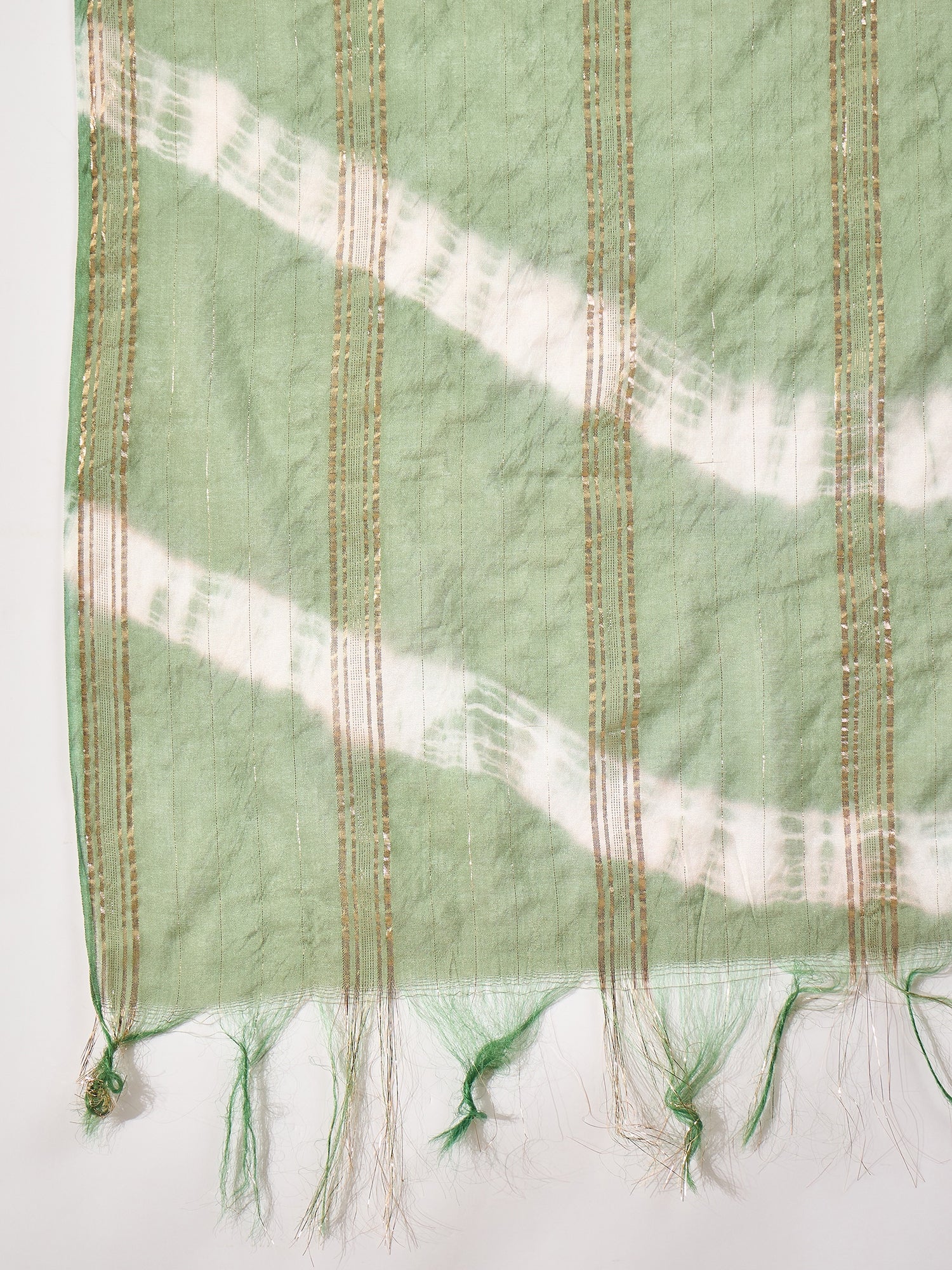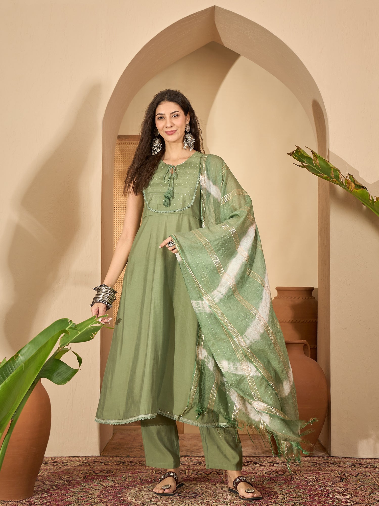 Green solid and embroidered silk blend a-line kurta pant dupatta set. Kurta has round neck with embroidery & tassels on it and sleeveless. Green Solid silk blend pant has fully elasticated waistband. Paired with leheriya printed lurex dupatta. Kurta Length- 45'' Inch, Pant Length- 38'' Inch, Dupatta Length- 2.30 Mtr.