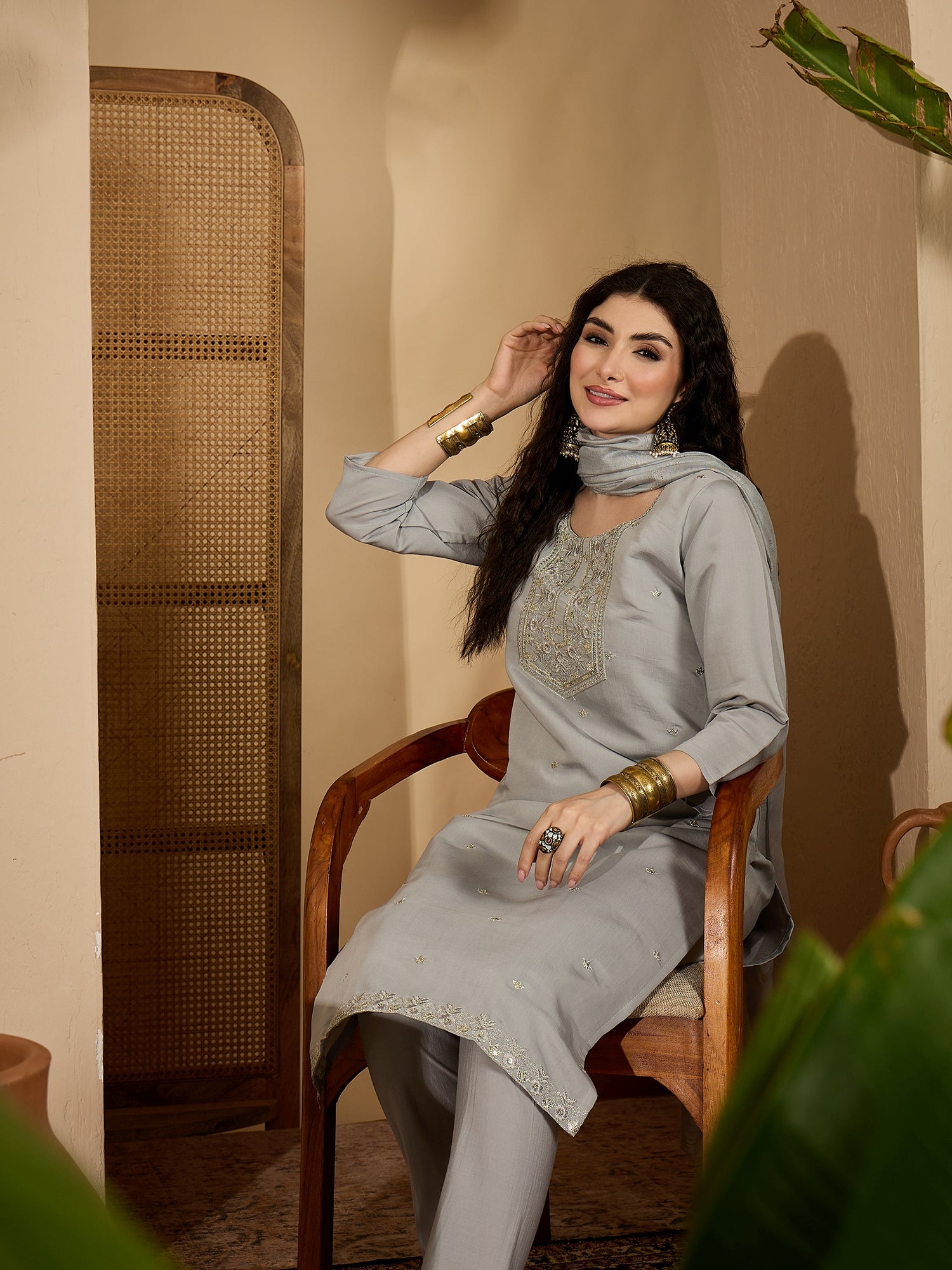 Stylum Women's Grey Solid & Embroidered Silk Straight Kurta Pant Dupatta Set (KPDGREYMUNCH)