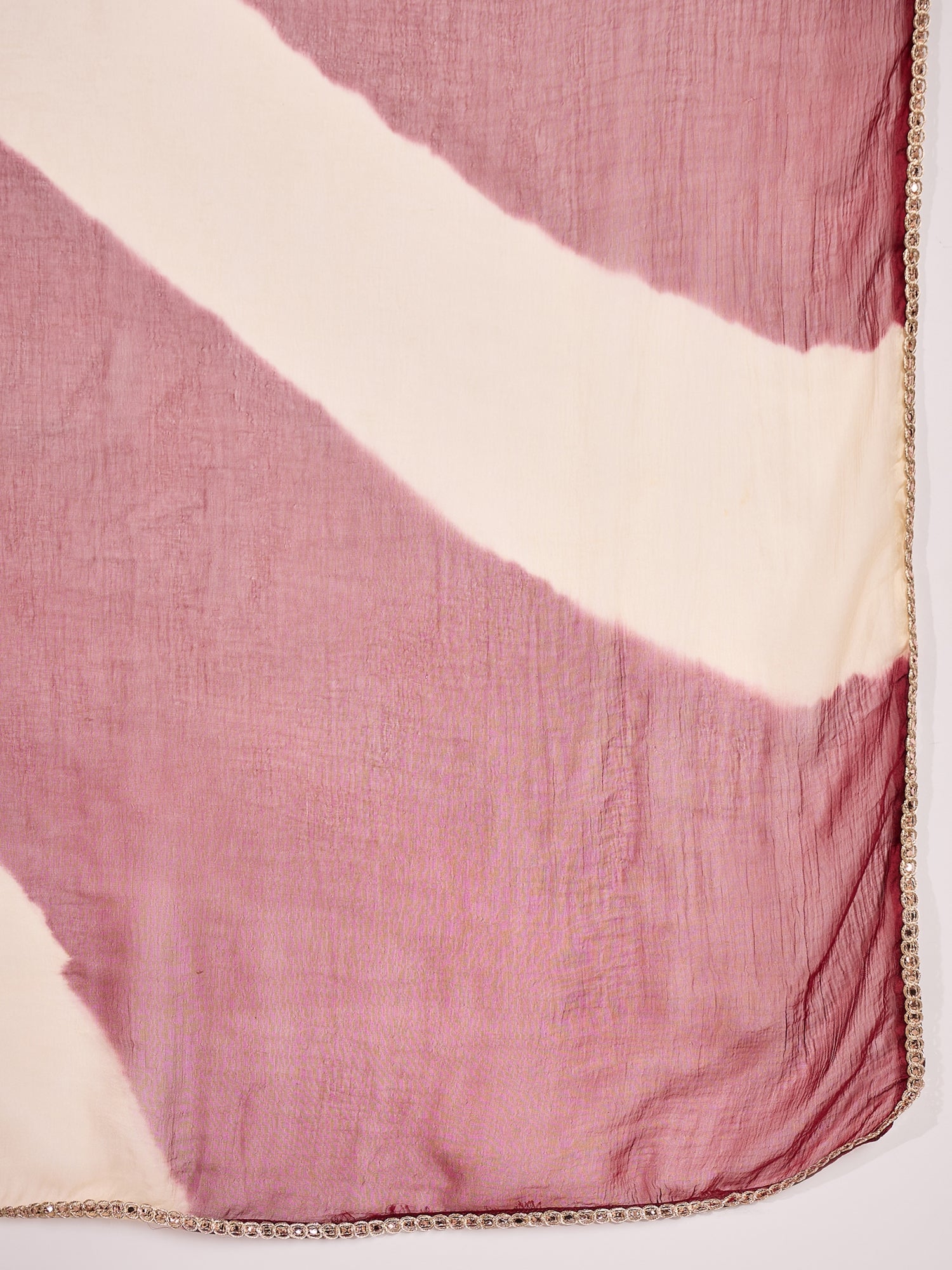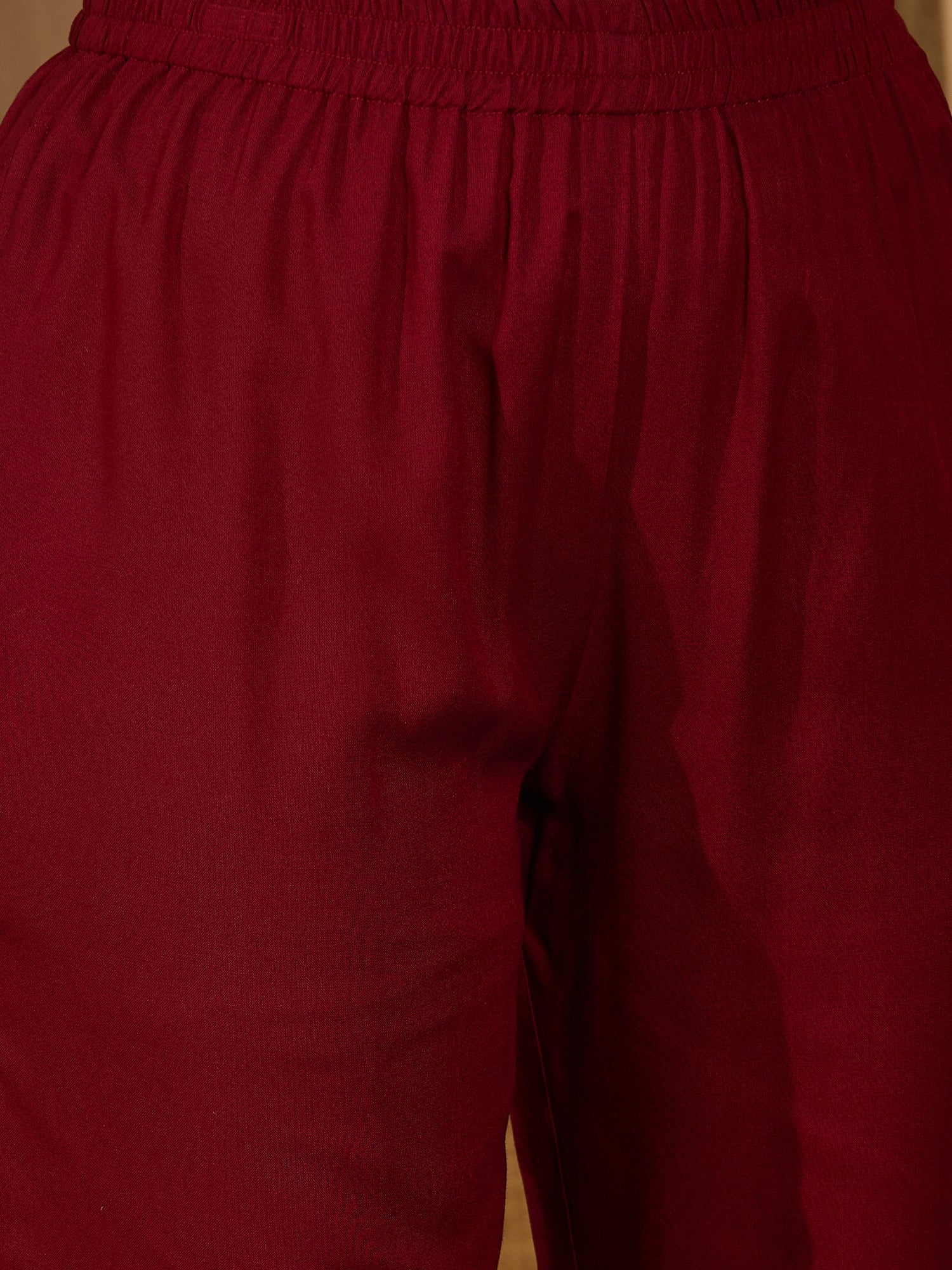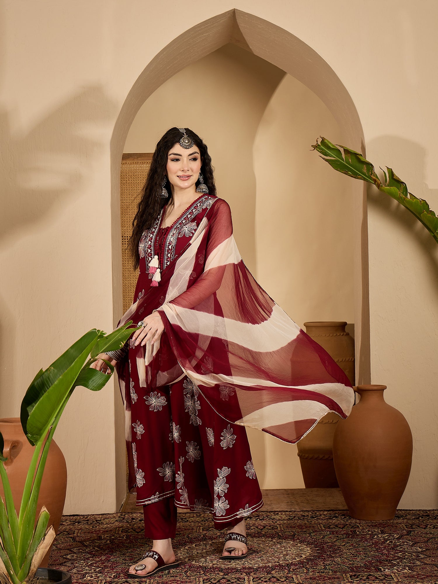Maroon floral printed rayon flared kurta pant dupatta set. Kurta has v-neck with embroidery, dori & tassel, lace detailing on it and sleeveless. Maroon solid rayon pant has fully elasticated waistband. Paired with chiffon leheriya printed dupatta with lace on it. Kurta Length- 48'' Inch, Pant Length- 38'' Inch, Dupatta Length- 2.30 Mtr.