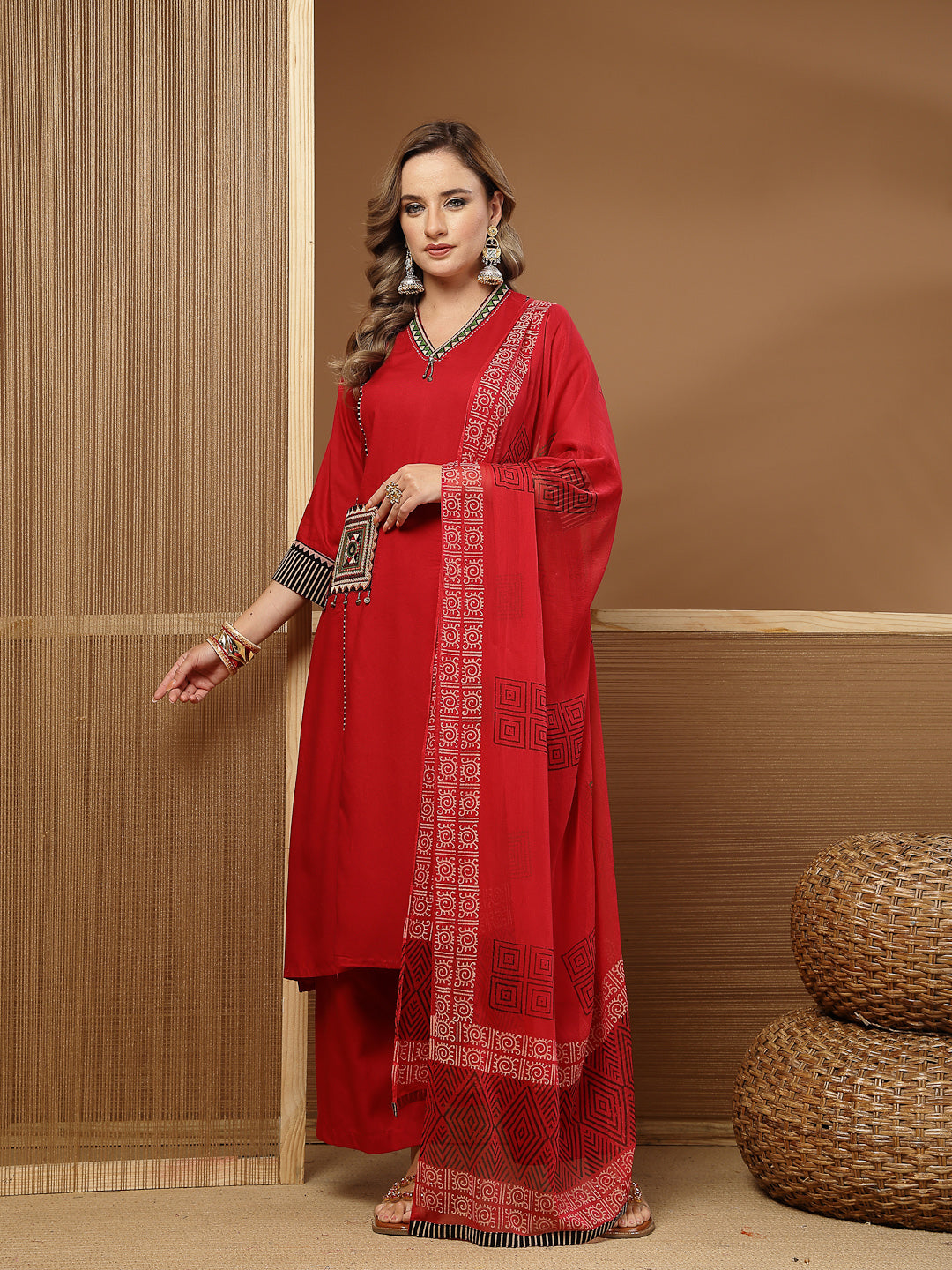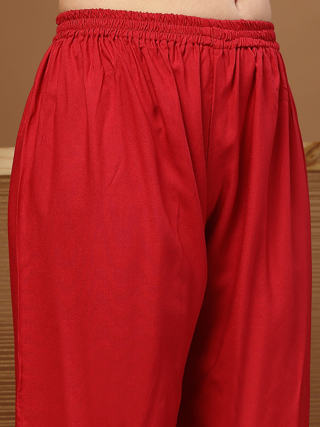 Maroon solid rayon straight kurta palazzo dupatta set. The kurta has v-neck with coins / printed border and fab piping detail, it has both side pockets with embroidery and regular sleeves with printed border. Maroon solid rayon pant has fully elasticated waistband. Paired with maroon printed chiffon dupatta. Kurta Length- 46'' Inch, Palazzo Length- 38'' Inch, Dupatta Length- 2.25 Mtr