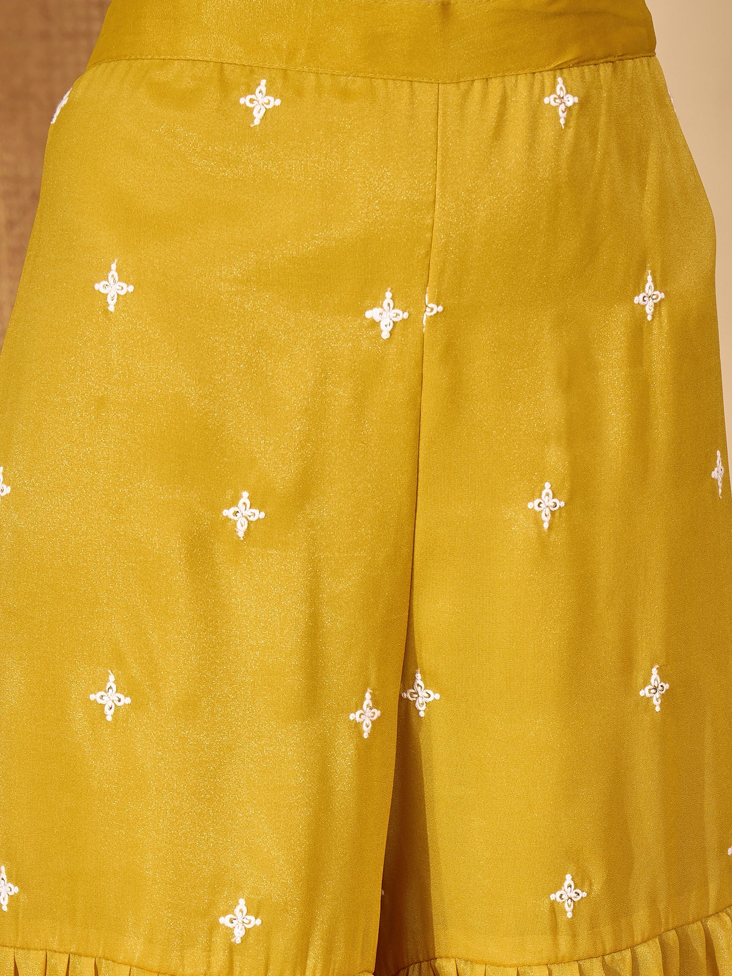 Mustard supernet solid and embroidered straight kurti sharara dupatta set. Kurti has round neck with embroidery yoke & border on it and regular sleeves with embroidery on it. Mustard supernet embroidered sharara has half elasticated waistband with lace on it. Paired with mustard supernet embroidered dupatta with lace on it. Kurti Length- 30'' Inch, Sharara Length- 44'' Inch, Dupatta Length- 2.30 Mtr.