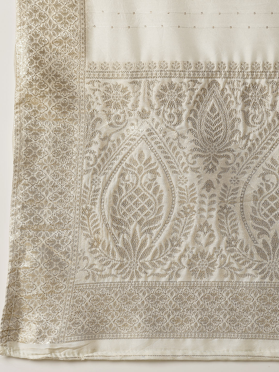 Festive brocade work off white silk blend straight kurta pant dupatta set. Designed with beautiful cord embroidery. It has 3/4 sleeves & fully elasticated solid silk blend pant. Paired with brocade dupatta. Kurta Length- 48" Inch, Pant Length - 38'' Inch, Dupatta Length - 2.30 mtrÂ