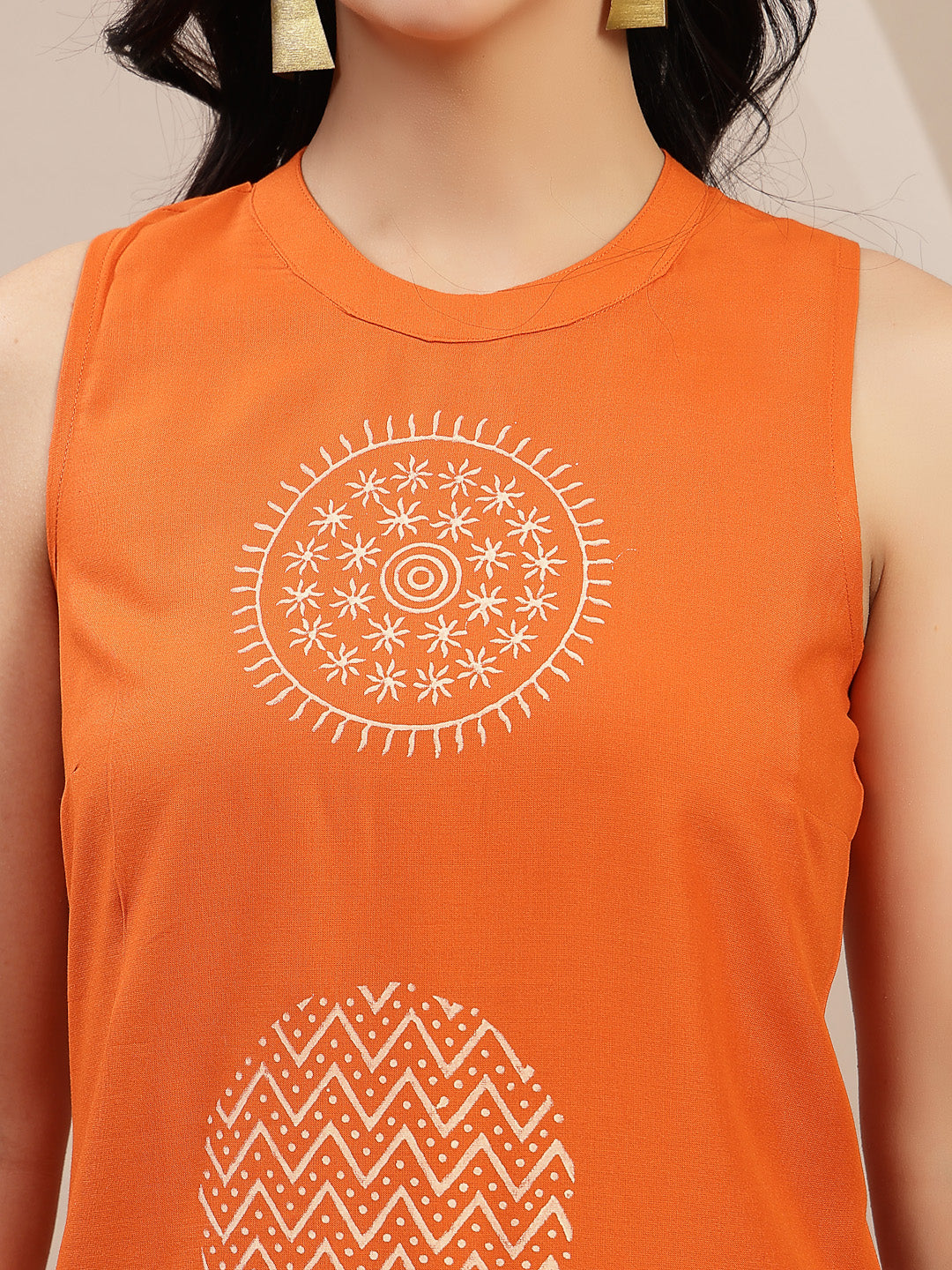 Orange solid rayon straight kurta pant set. Kurta has mandarin collar with back side button closure and sleeveless. Orange solid rayon pant has fully elasticated waistband. Kurta Length- 45'' Inch, Pant Length- 38'' Inch