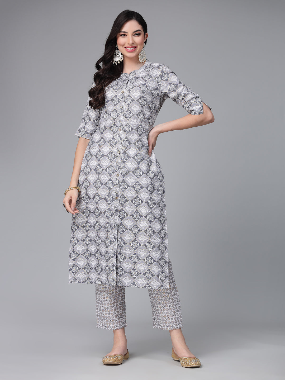 Grey printed cotton blend straight kurta and printed pant which has fully elasticated waistband. Pair it with beautiful accessories like jhumkas, kadas and jutties to enhance the look. Products Kurta Length- 45" Inch, Pant Length - 38" Inch.