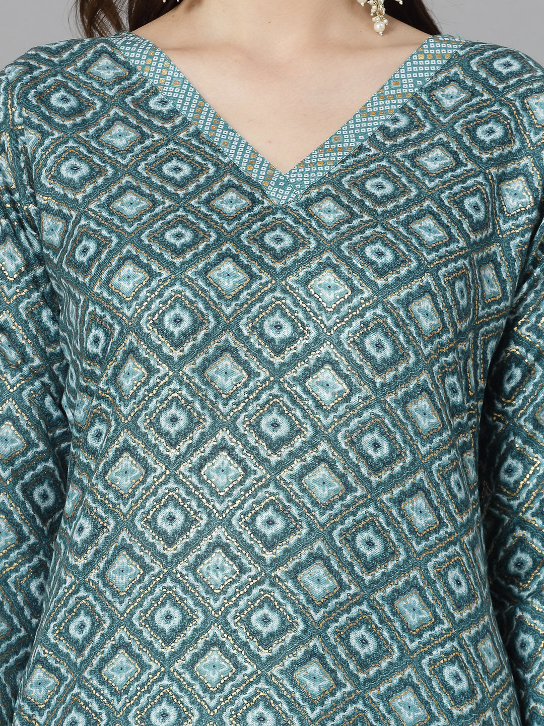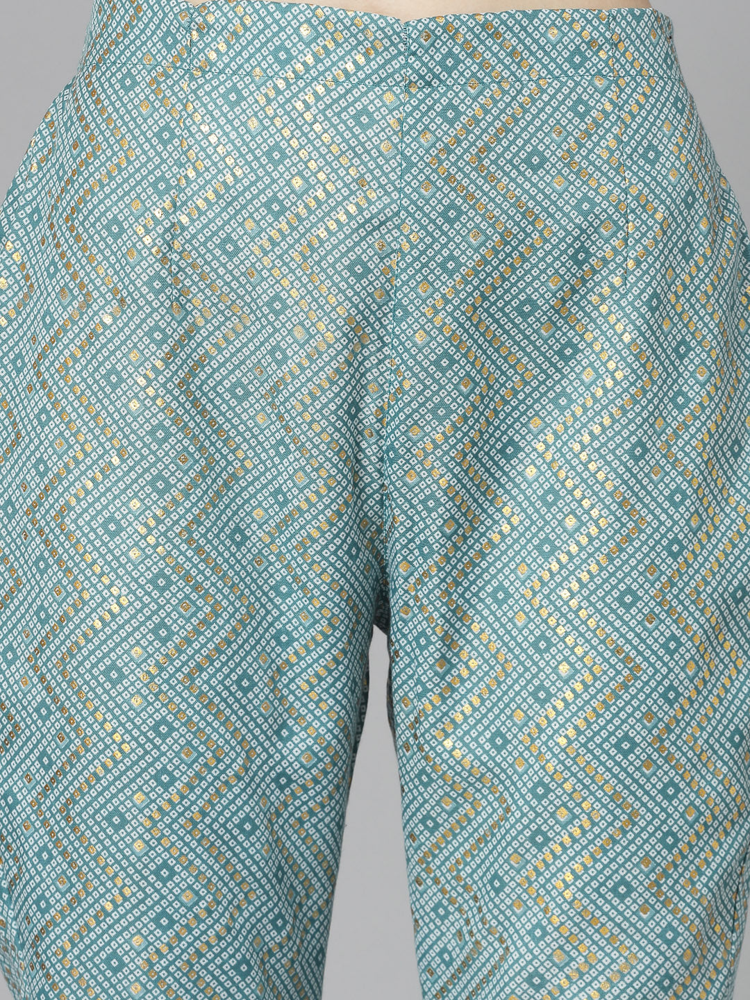 Rama green printed cotton blend straight kurta with beautiful trendy V-neck line and bandhej printed pant which has full elasticated waistband. Kurta Length- 41" Inch, Pant length - 38'' inch.