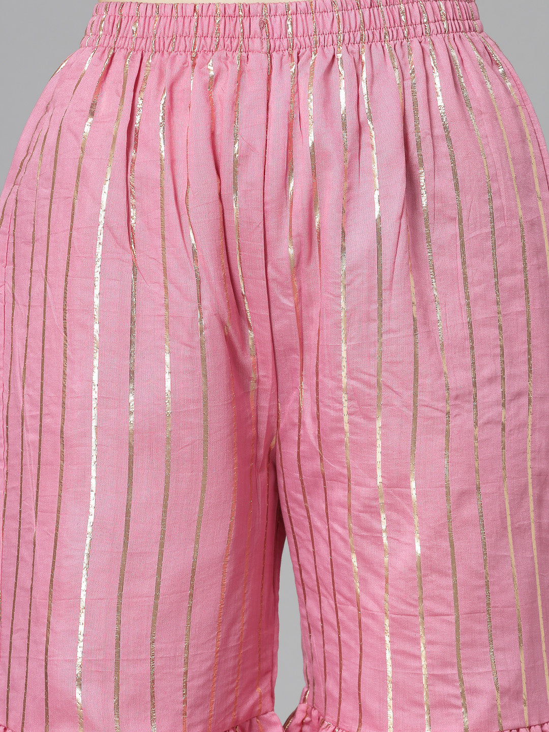 Look beautiful in the upcoming festive and wedding season in our beautiful kurta sharara dupatta set. This Pink printed lurex chanderi sharara set with dupatta features a beautiful kurta with elegant embroidery on the yoke that adds a touch of charm to the ethnic wear. Accompanying the kurta is a matching lurex sharara featuring a full elasticated waistband for a comfortable fit. The sharara also boasts lace detailing on the edges, adding a subtle touch of sophistication.To complete this captivating sharara set with dupatta, a solid chiffon dupatta is included, featuring delicate lace attachments