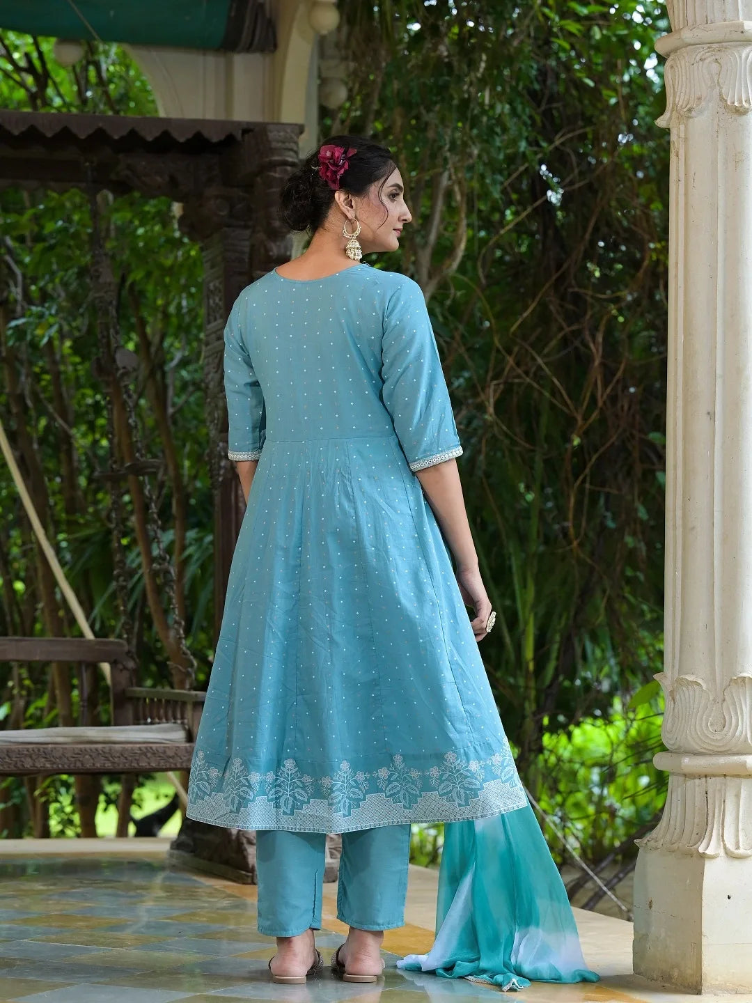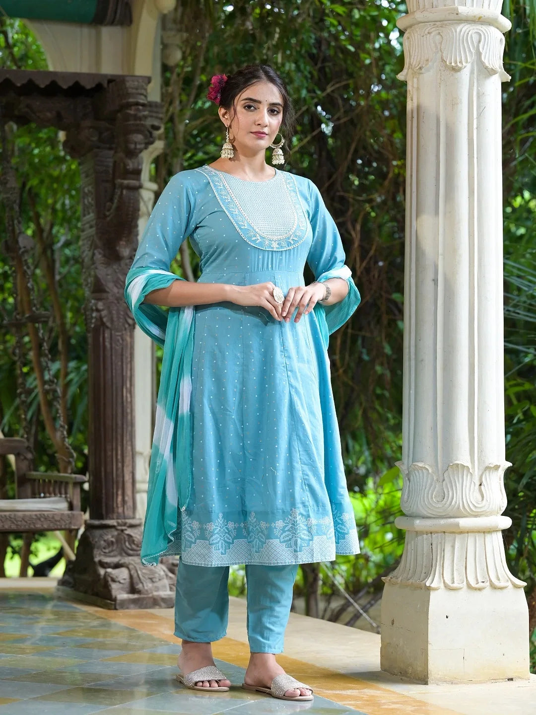 Invest in the Stylum Women's Printed & Embroidered Cotton Anarkali Kurta Set with Dupatta for a timeless and stylish addition to your wardrobe. This set features a sky blue printed and embroidered cotton anarkali kurta with a length of 46 inches, paired with solid pants with a length of 38 inches. The double shaded lehariya dupatta adds a touch of elegance, with lace taping on both sides for a beautiful finishing touch. This set is perfect for any occasion, whether it's a wedding, festive celebration or a family gathering. Pair it with your favourite earrings and heels for a graceful and sophisticated look.