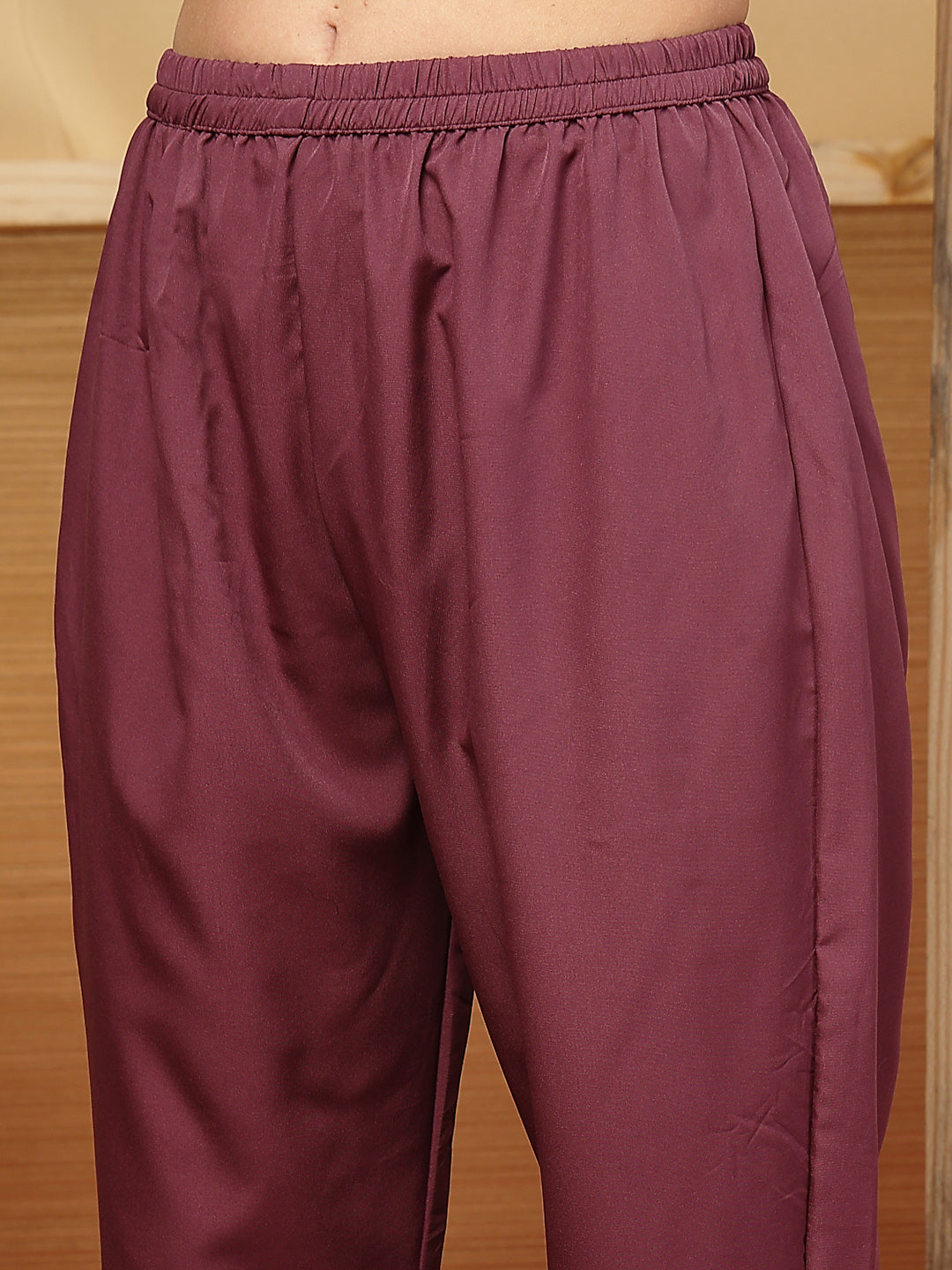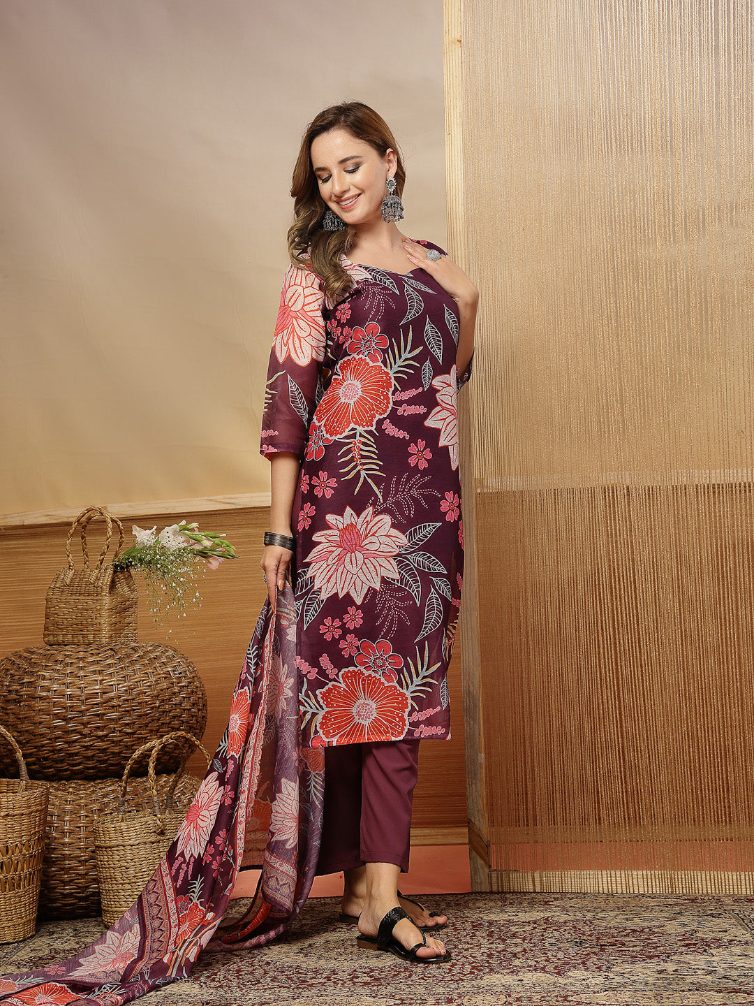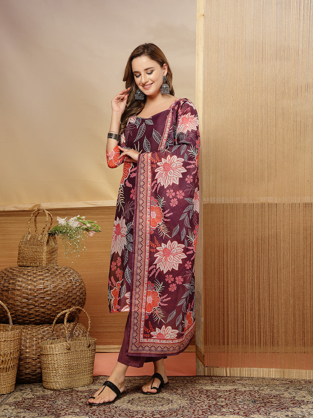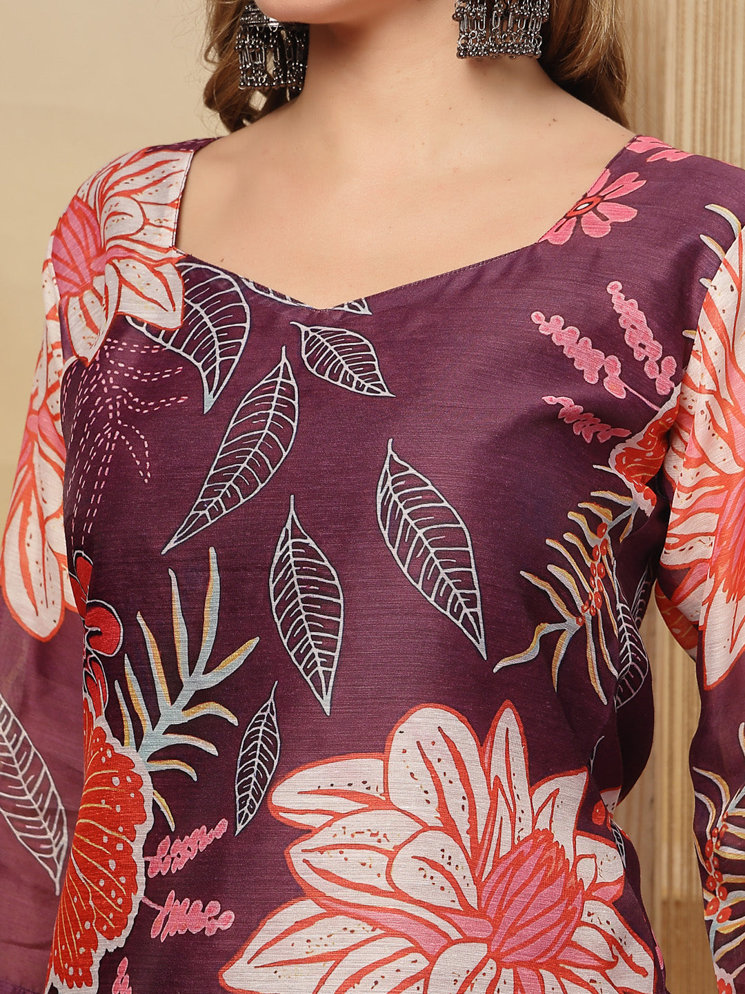 Purple floral printed chanderi silk straight kurta pant dupatta set. The kurta has v-neckline with border / embellished detailing and regular sleeves, It has inside cotton lining. Purple printed polyster pant has fully elasticated waistband. Paired with purple chanderi silk printed dupatta. Kurta Length - 46'' Inch, Pant Length - 38'' Inch, Dupatta Length - 2.25 Mtr