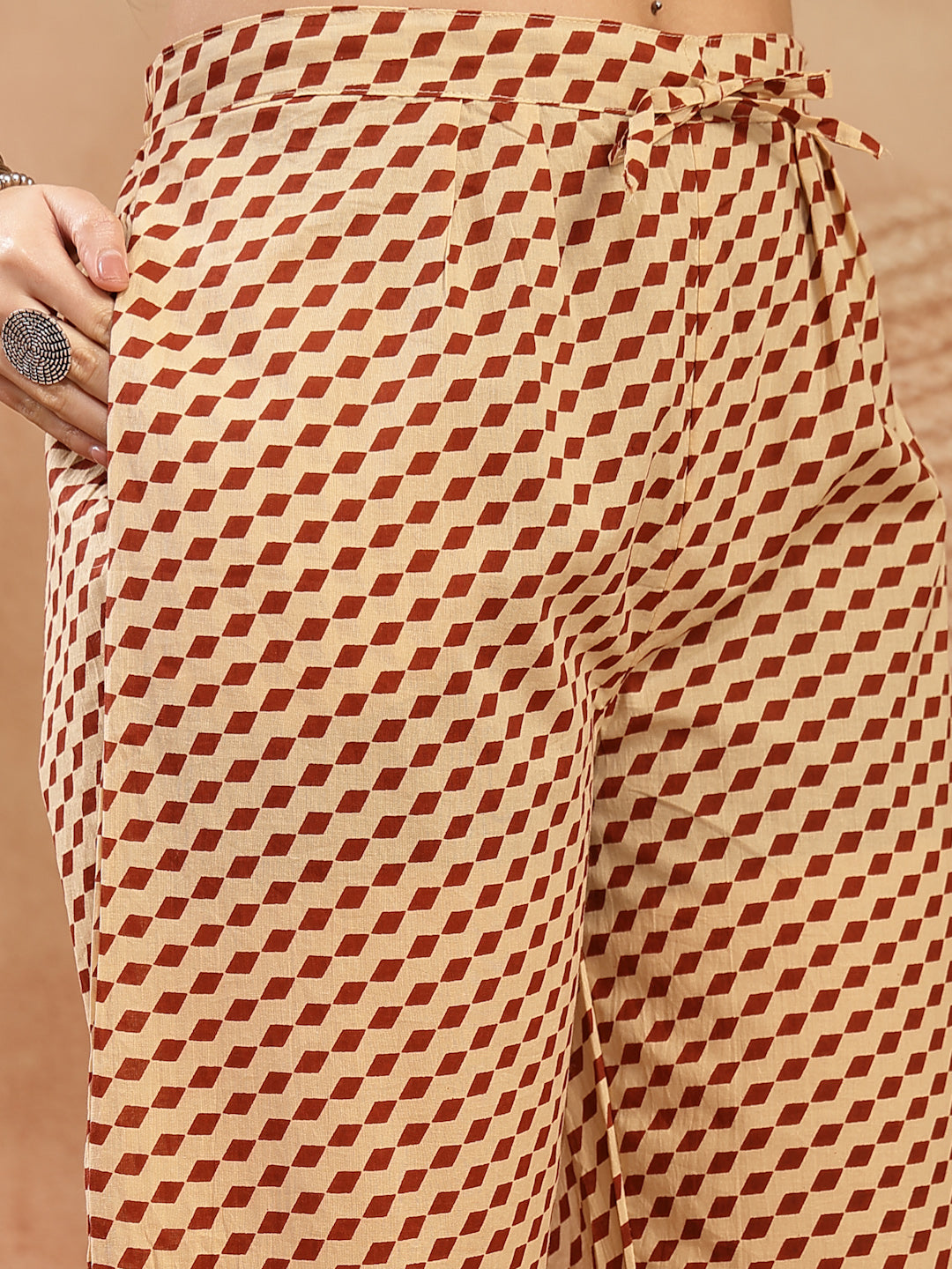 Red printed cotton a-line kurta palazzo dupatta set. The kurta has round neck with mirror work detail / 3/4th regular sleeve. Beige printed cotton palazzo has half elasticated with one side pocket. Paired with beige printed voile dupatta. Kurta Length- 46'' Inch, Pant Length- 38'' Inch, Dupatta Length- 2.25 Mtr