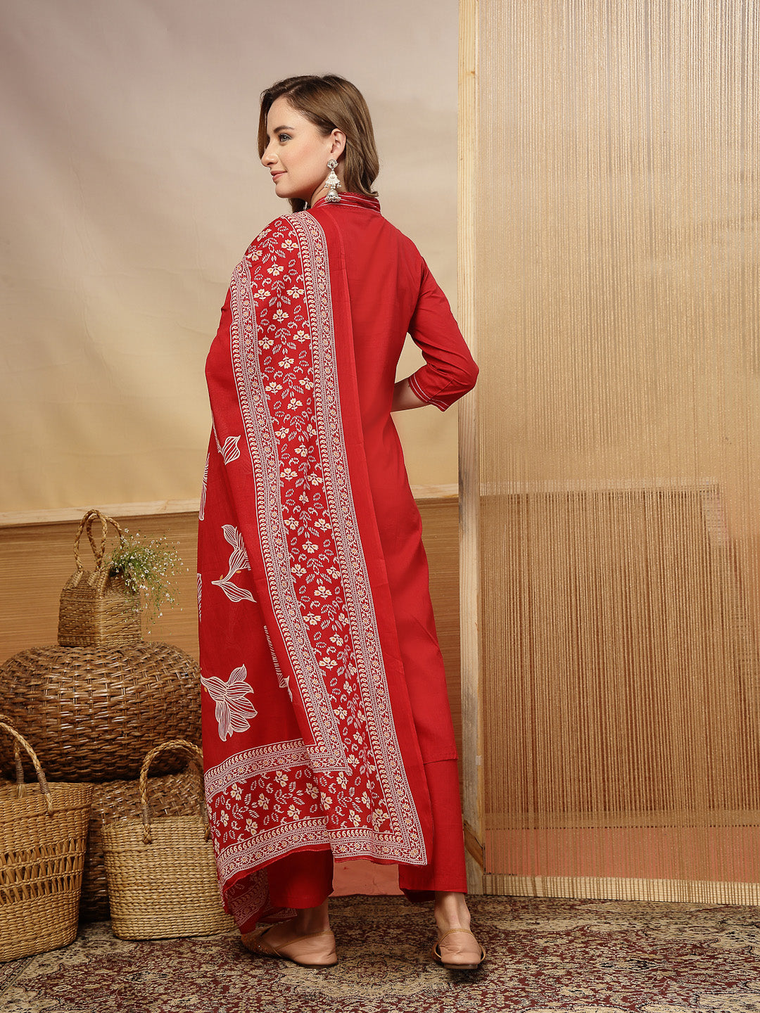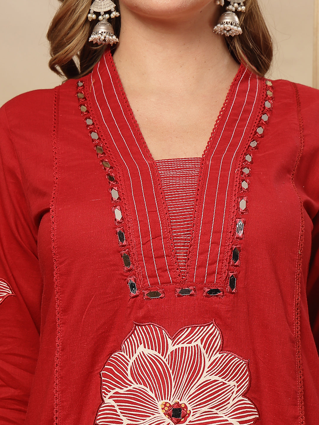 Red solid and embroidered cotton a-line kurta pant dupatta set. The kurta has embroidery with mirror/white beads tassels/kantha and crochet lace on v-neckline and front, it has both side pockets, regular sleeves with kantha border. Yellow solid pant has half elasticated waistband with one side pocket. Paired with printed yellow mulmul dupatta. Kurta Length - 45'' Inch, Pant Length - 38'' Inch, Sleeve Length - 17'' Inch, Dupatta Length - 2.30 Mtr