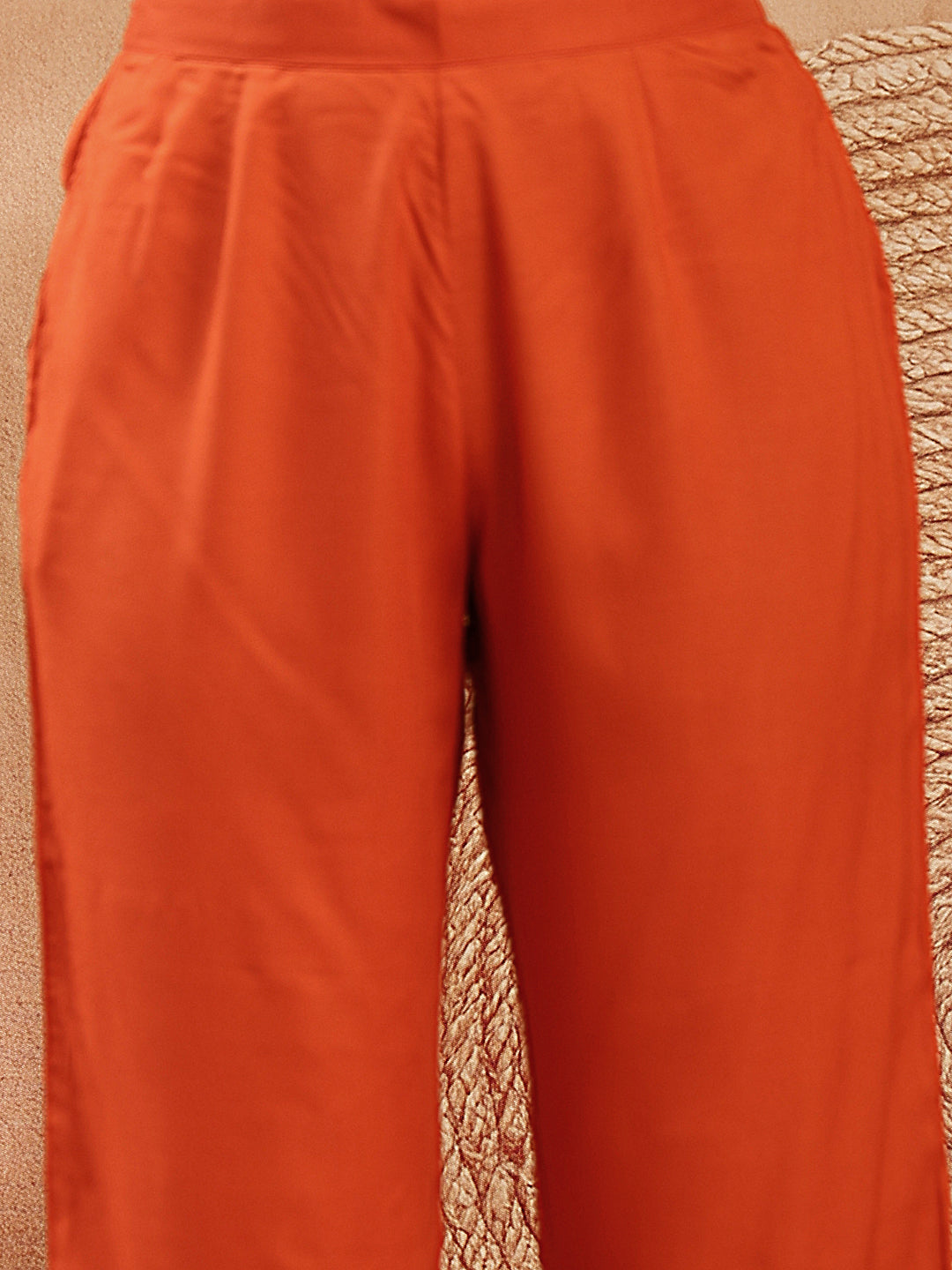 Rust solid rayon straight kurta pant dupatta set. The kurta has v-neck with thread work and regular sleeves with thread work. Rust solid rayon pant has fully elasticated waistband with one side pocket. Paired with printed kota doriya dupatta. Kurta Length - 46'' Inch, Pant Length - 38'' Inch, Dupatta Length - 2.25 Mtr.