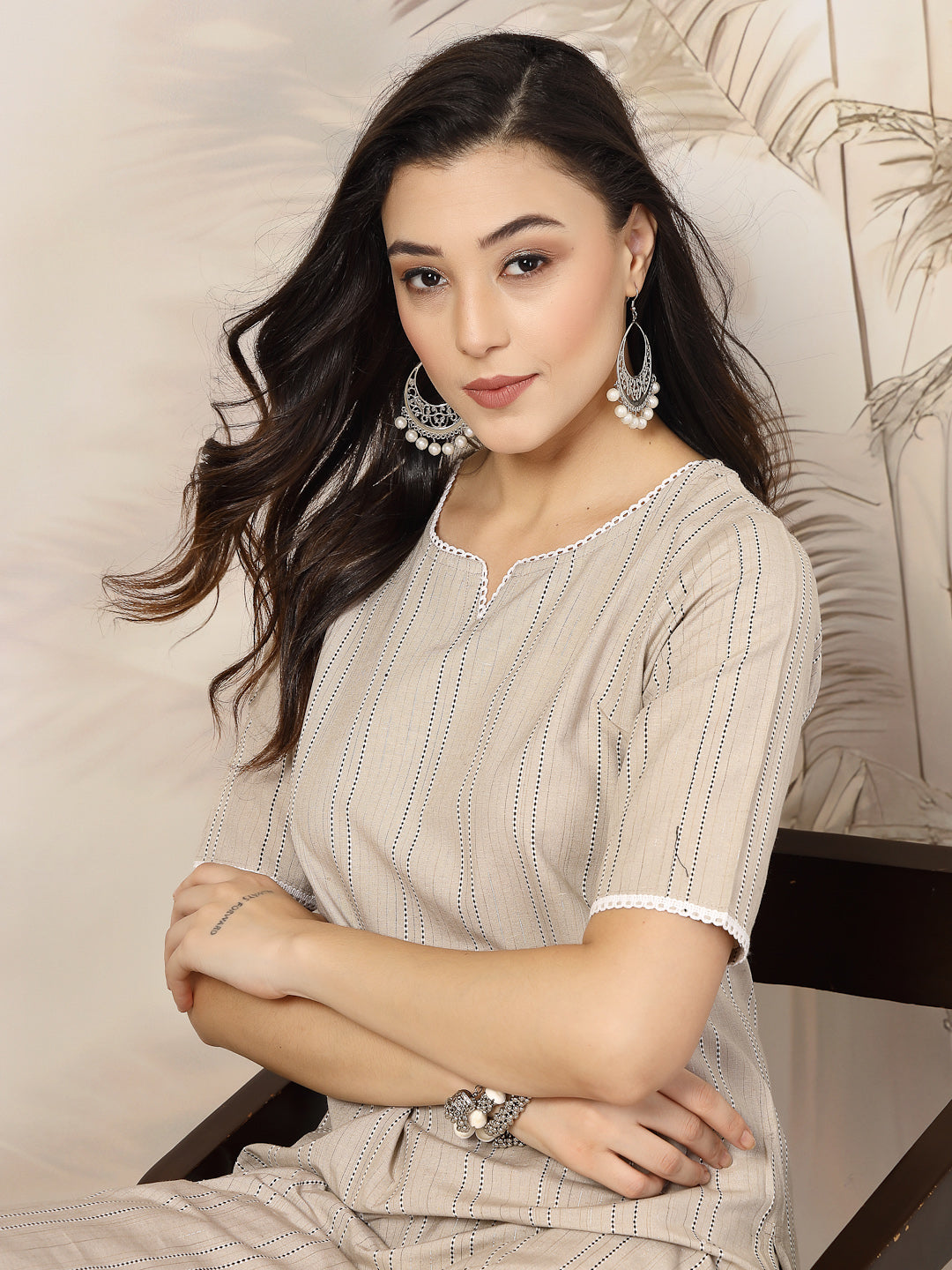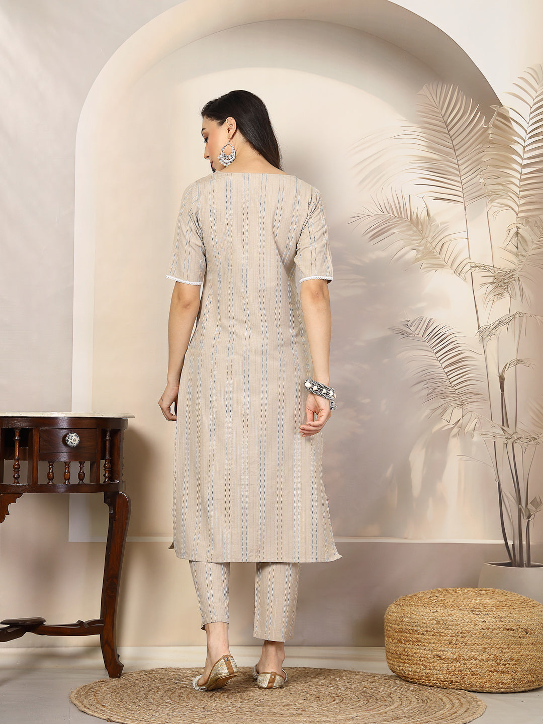 Cotton blend Beige self woven striped straight kurta with knotched neckline, 3/4th sleeves and side slit. Mauve self woven striped fully elasticated pant. Product kurta length - 45" Inch, pant length - 38'' Inch. Pair it with earrings and juttis to complete the look.