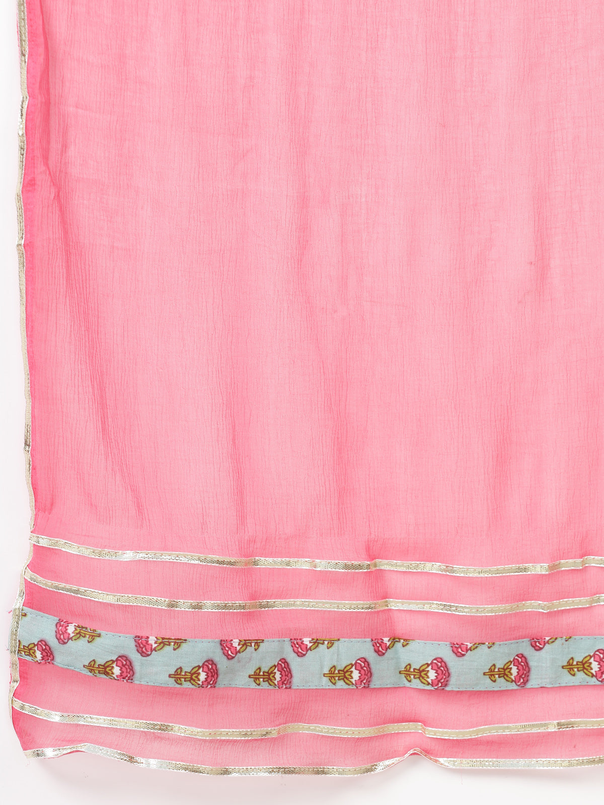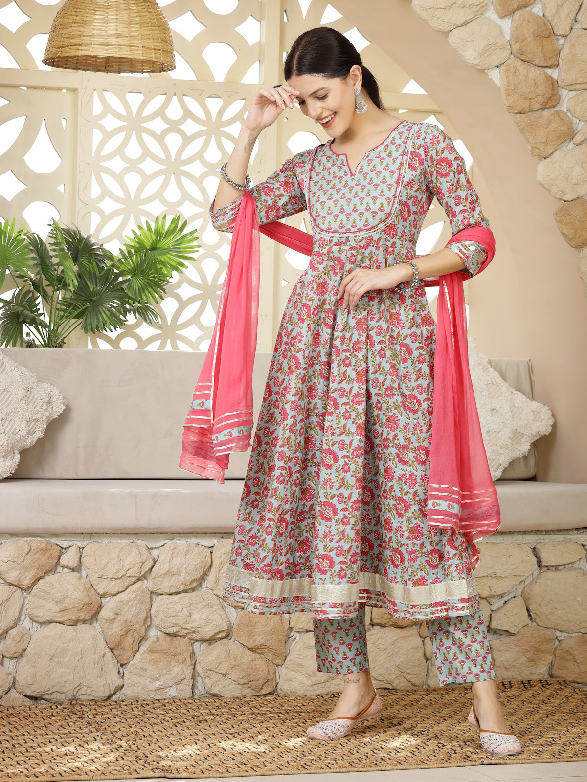 Turquoise blue cotton floral printed anarkali kurta with beautiful printed yoke and gota detailing on it. kurta sleeves and flared designed with hravy gota laces. Has fully elasticated cotton printed pants. Chiffon solid dupatta has gota laces and printed border. Kurta Length- 48" Inch, Pant Length - 38'' Inch, Dupatta Length - 2.30 mtr Â