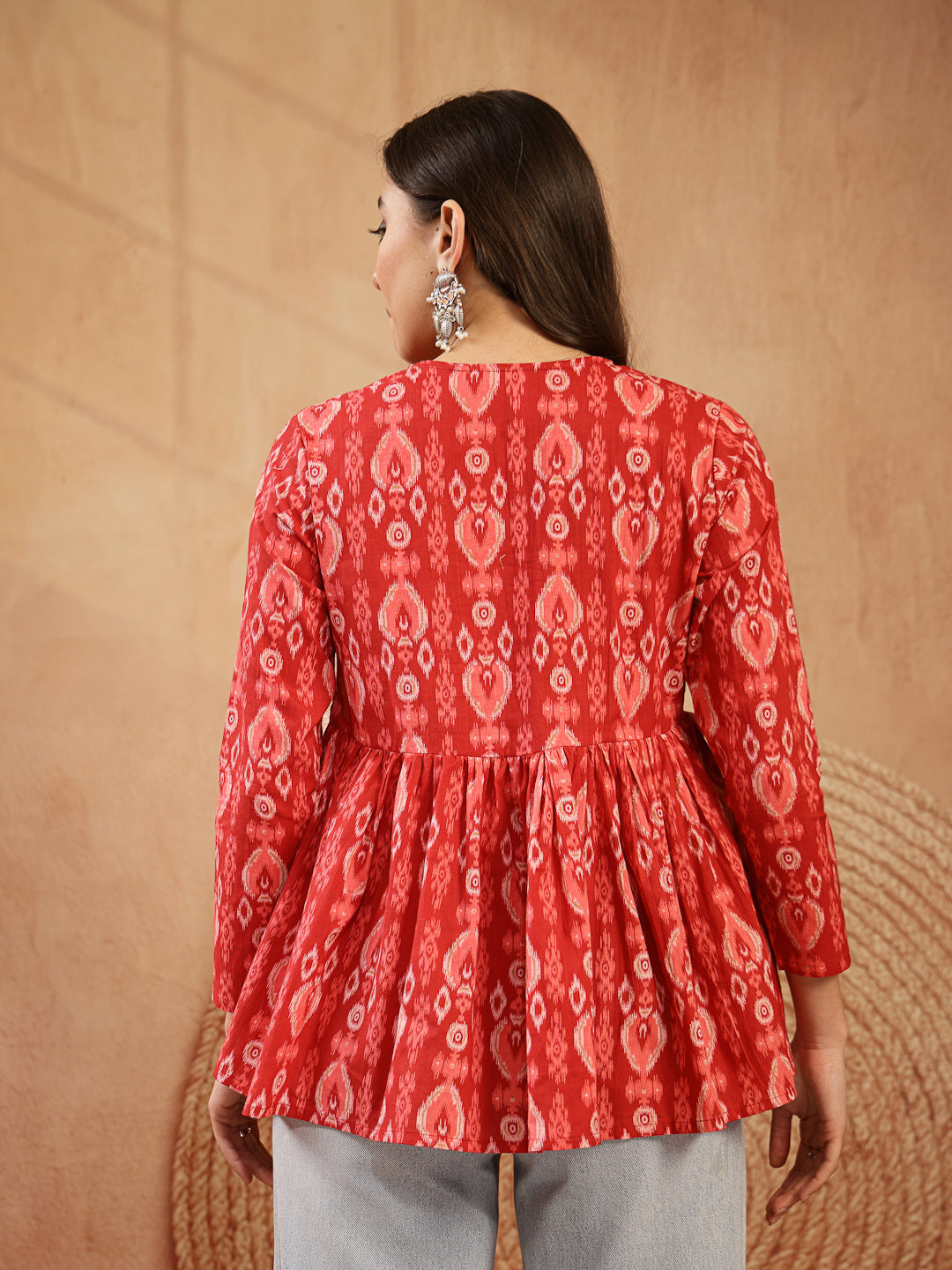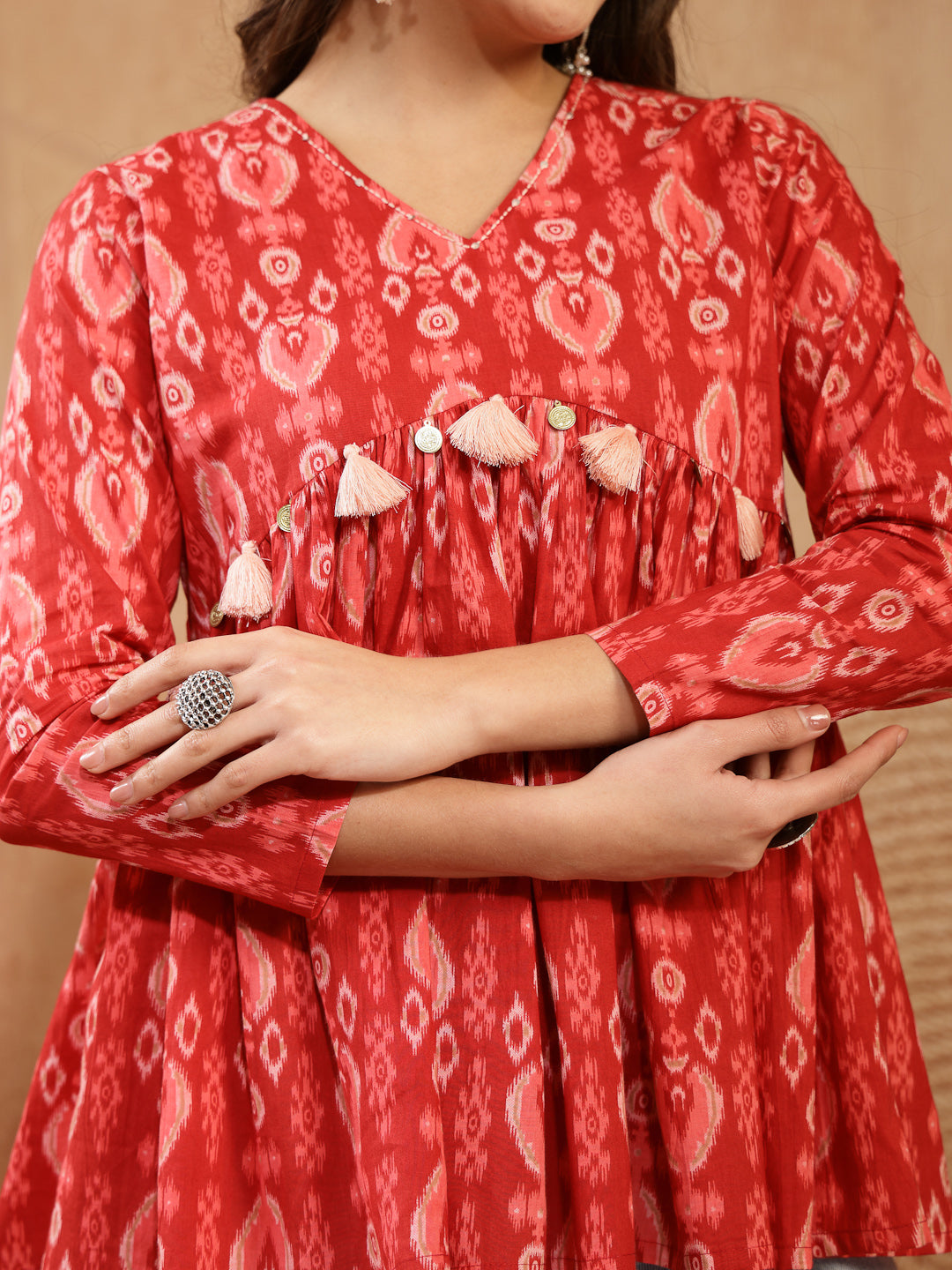 Maroon ikkat printed cotton empire top. Top has v-neckline with coins-tassels/gathers and plackets and 3/4th regular sleeves. Top Length- 30'' Inch