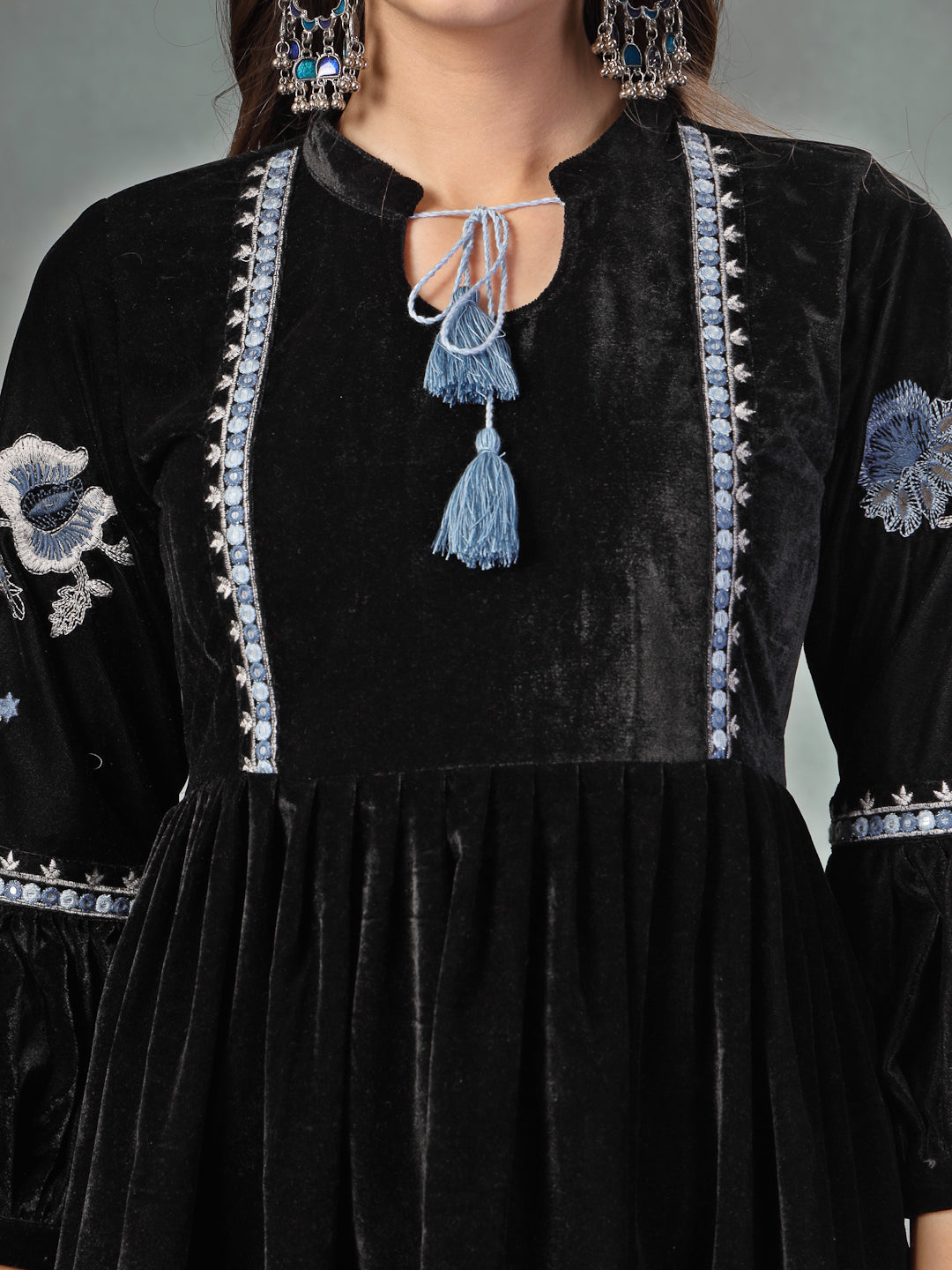 Velvet Black solid mandarin collar flared dress. dress has embroidery on sleeves and front on it. Dress Length- 38" Inch.