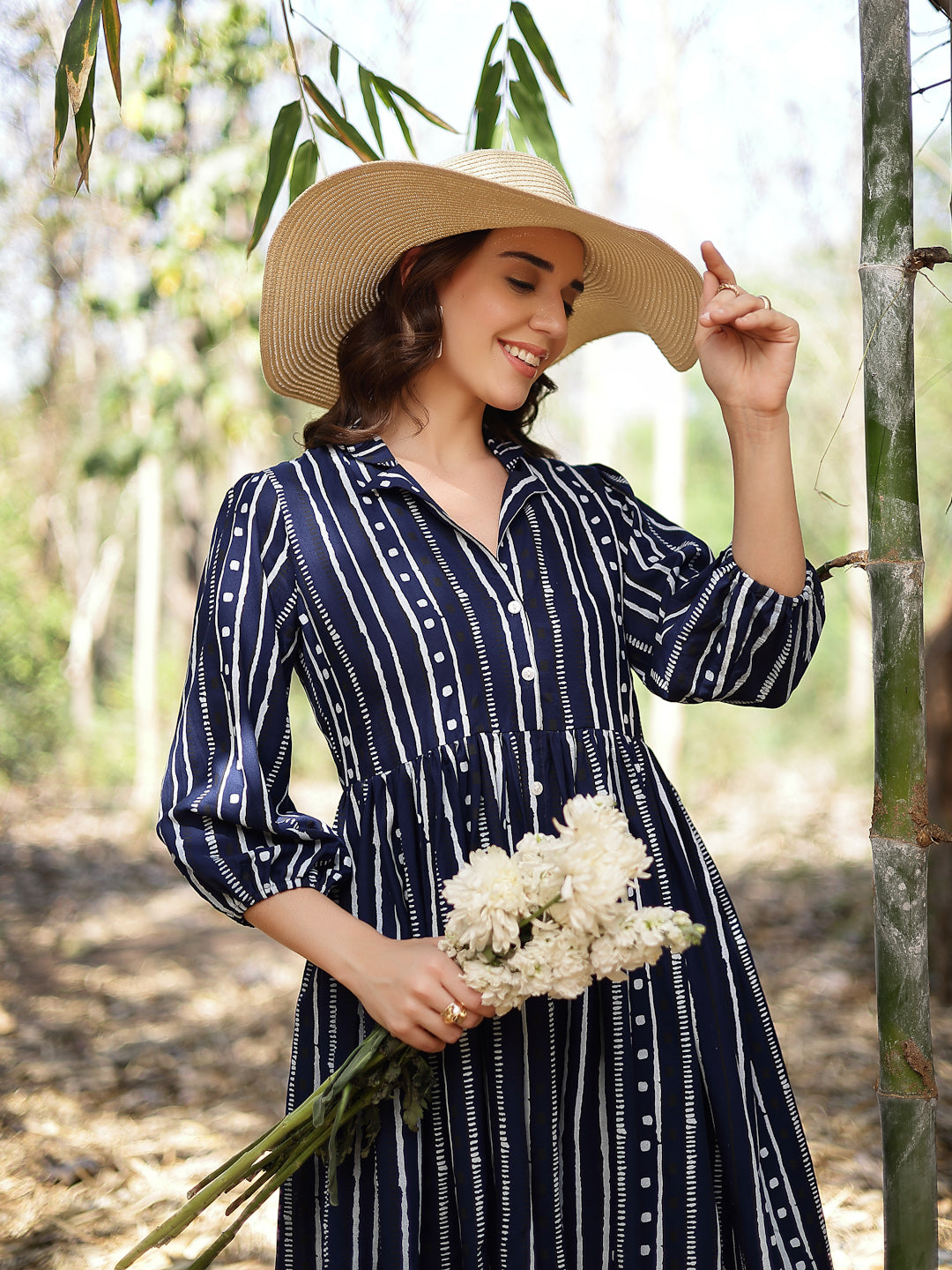 Blue rayon striped khari printed dress. Dress has coat collar front button placket, Gathred and puff sleeves. Dress Length- 38'' Inch.