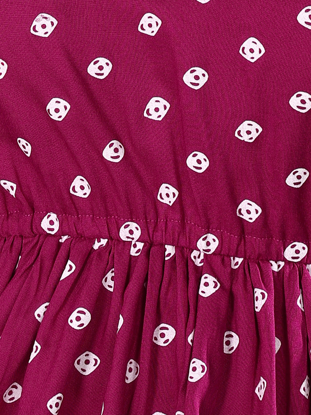 Pink Bandhej Printed Rayon Short Peplum Top. Top has lace on v-neck and shoulder tie-ups. Top Length- 25'' Inch.