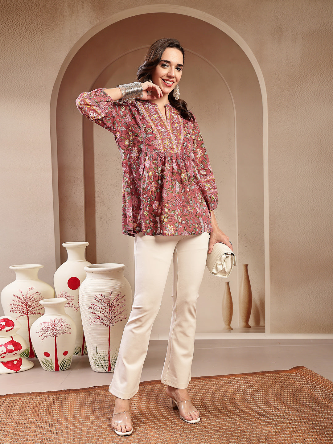 Pink floral printed cotton empire top. Top has mandrian collar with lace on it, gather pleated and 3/4th puff sleeves with lace on it. Top Length - 27'' Inch.