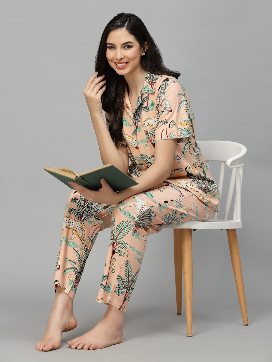 Experience unmatched comfort and effortless style with the Stylum Women's Animal Rayon Printed Night Suit. This set includes a jungle printed rayon shirt top and matching printed pants, designed to elevate your loungewear game.Crafted with care, the shirt top features a stylish button-down front and a convenient pocket, adding a touch of functionality. Its comfortable length ensures a relaxed fit that flatters every body type. The accompanying pants are designed with a full elasticated waistband, providing a comfortable and adjustable fit. The jungle print adds a playful yet sophisticated touch, making it ideal for both lounging around the house and cozy nights in.