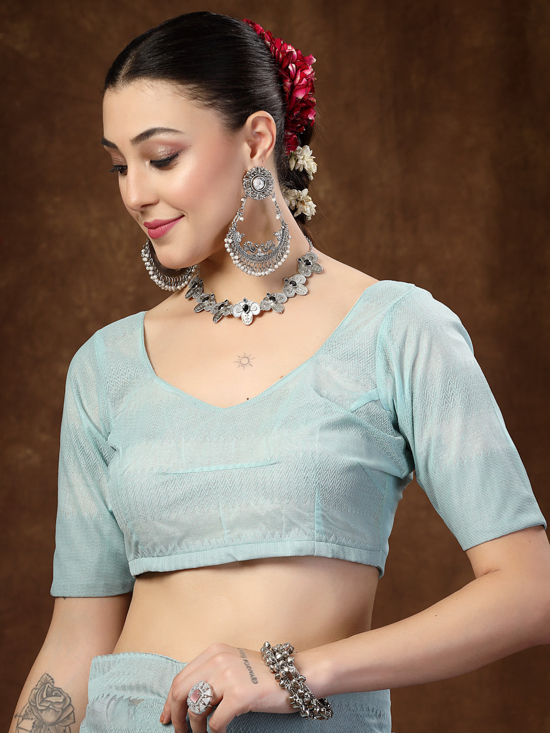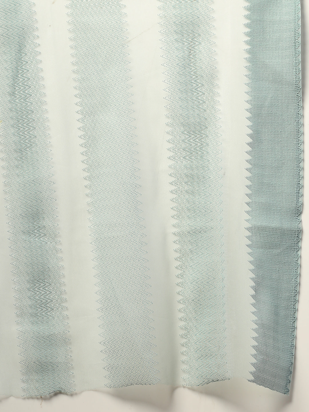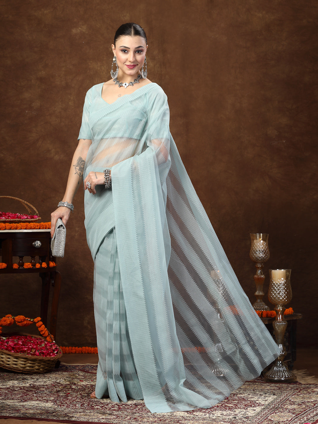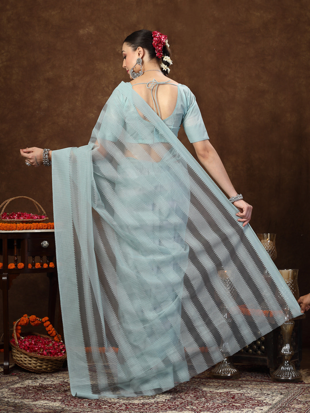 Aqua ethnic stripe embroidered net saree. This ethnic saree has embroidered border. Saree has unstitched blouse. Length - 5.30 mtr, Blouse - .80 mtr