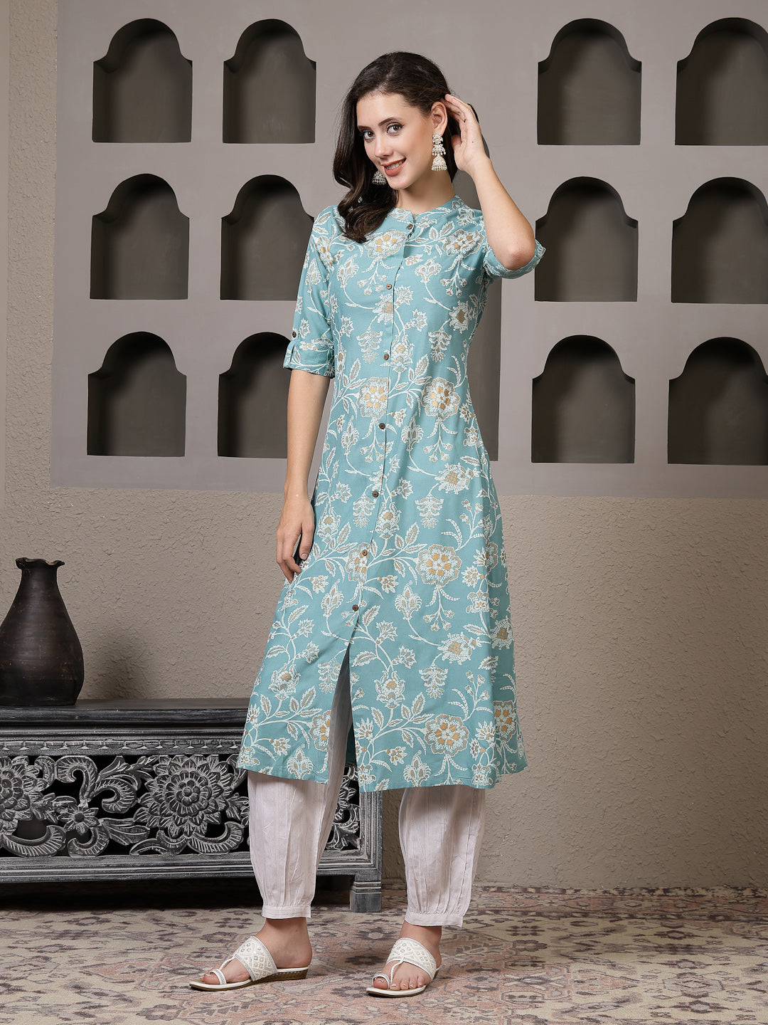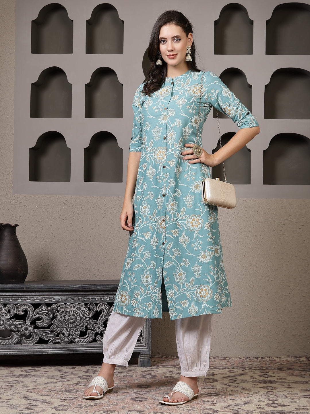 Rayon Aqua floral printed A-line kurta pathani pant set, with wooden button detailing, half sleeve, side slit. Solid fully elasticated pathani pant. Product kurta length is - 45" inch, Pant Length - 38" Inch.