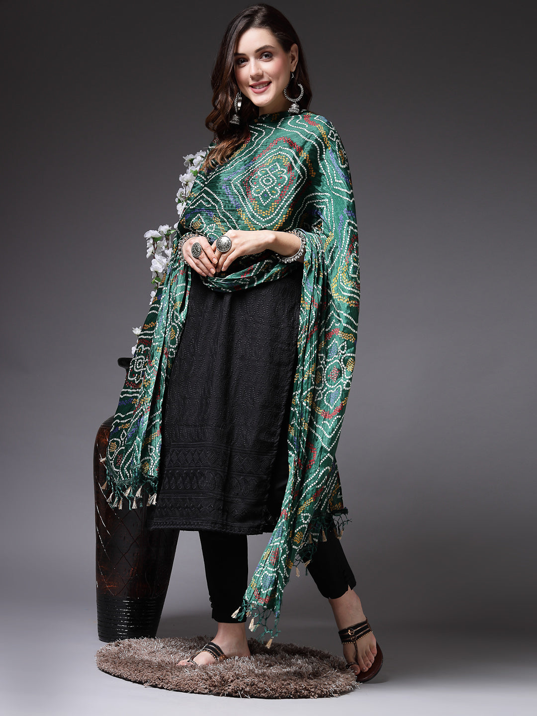 This beautiful silk blend green bandhani dupatta detailed with fringes and tasseles hem will enhance your look. Pair it with kurti or tunic and mojaris for a charming appeal. Dupatta Length:- 2.30 Mtr