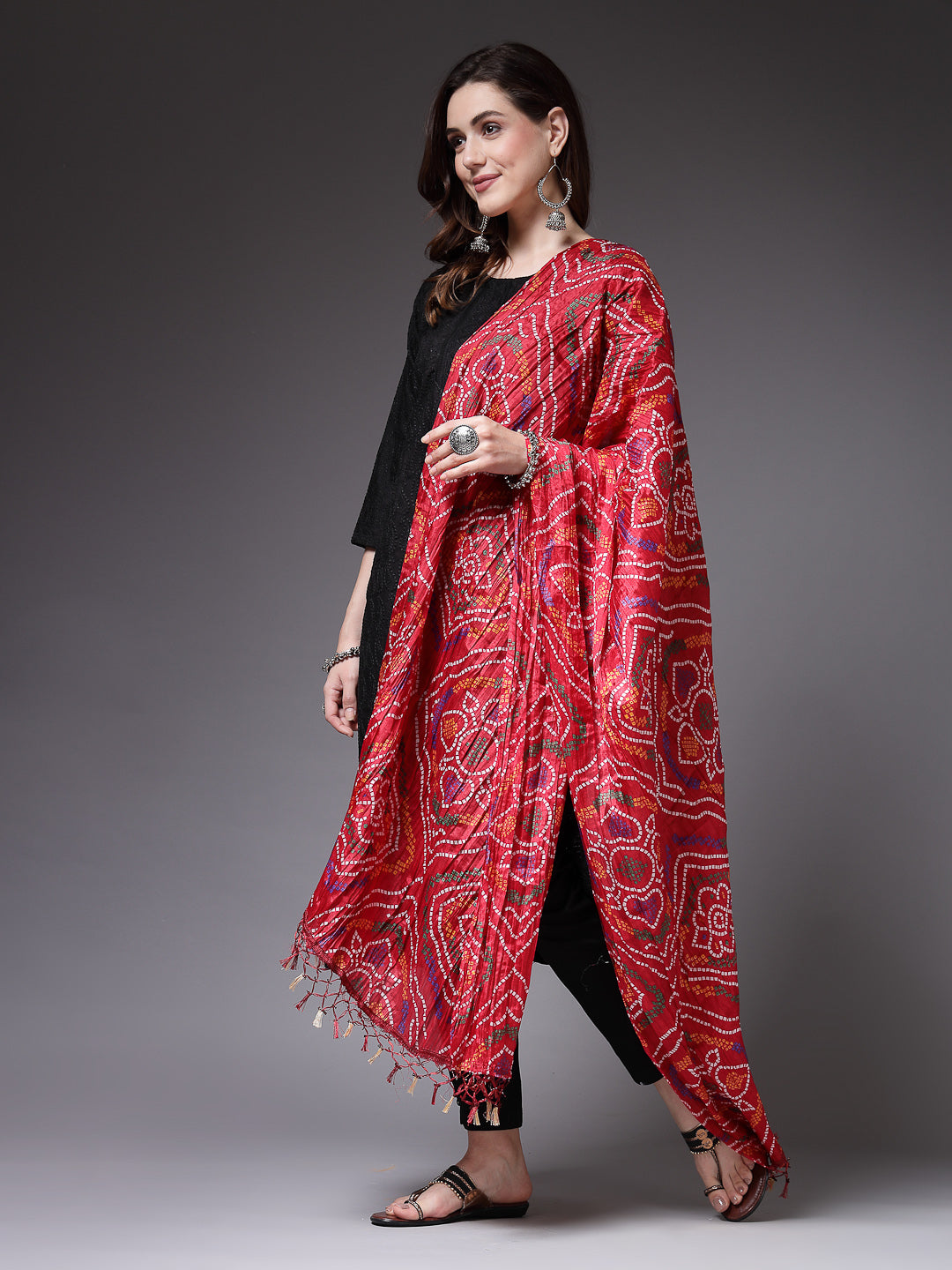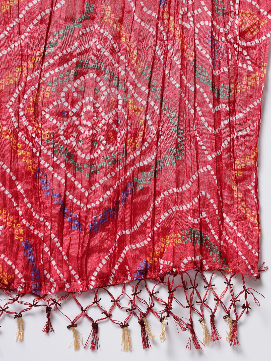 This beautiful silk blend red bandhani dupatta detailed with fringes and tasseles hem will enhance your look. Pair it with kurti or tunic and mojaris for a charming appeal. Dupatta Length:- 2.30 Mtr