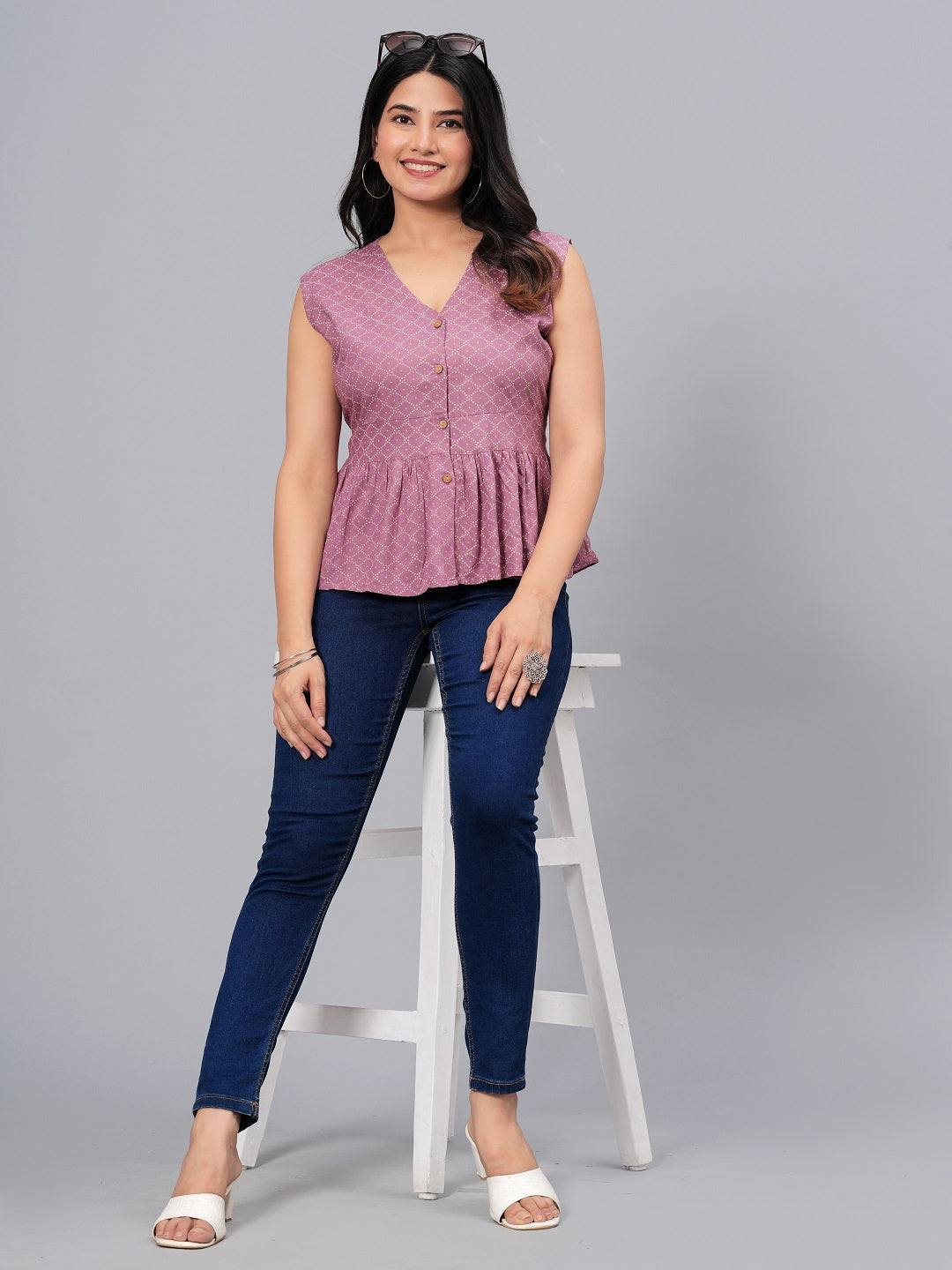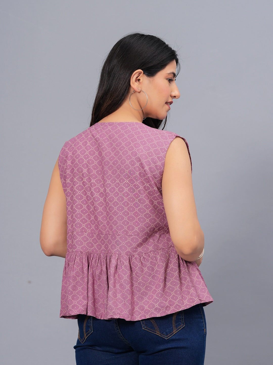Mauve Bandhej printed V- neck peplum top. Front Functional Placket with shell button. Sleeve less top with belt detailing on waist. Top length - 20'', Casula wear top. Â
