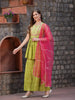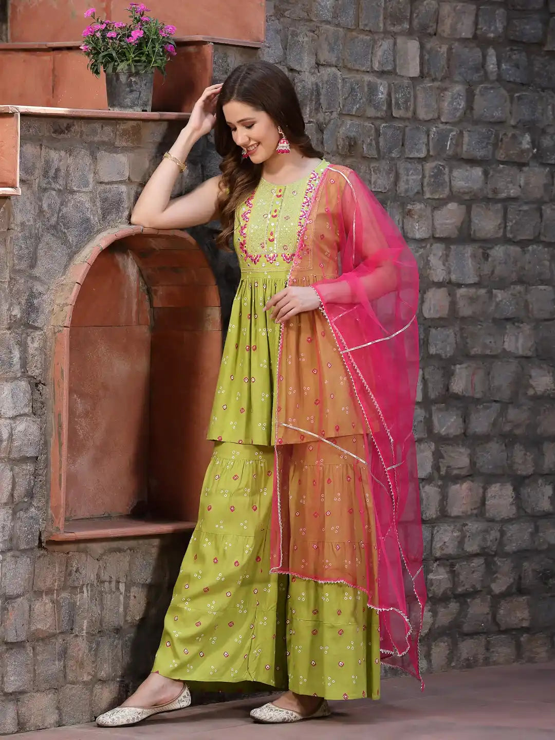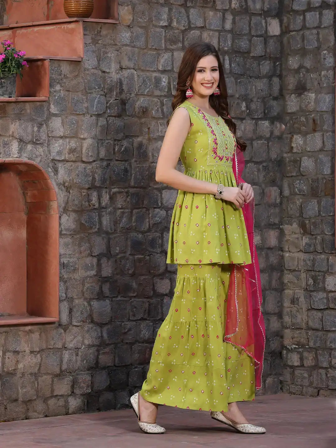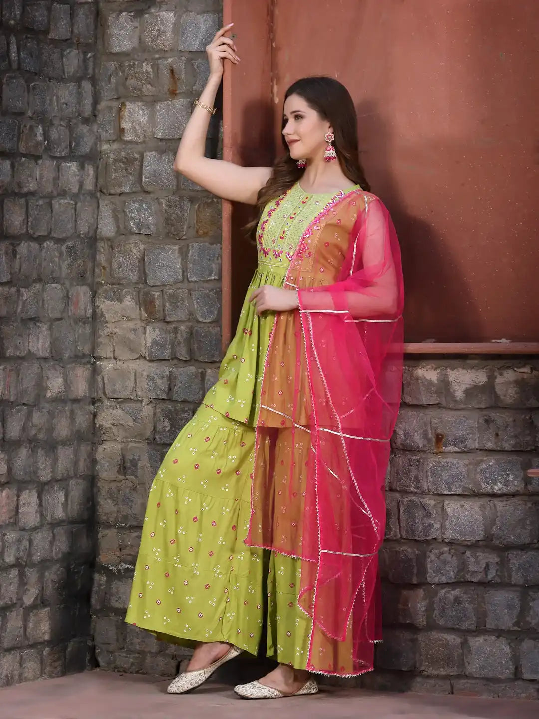 Stylum Women's Bandhej Printed & Embroidered Rayon Kurti Sharara Dupatta Set (KSDHEXAGREEN)