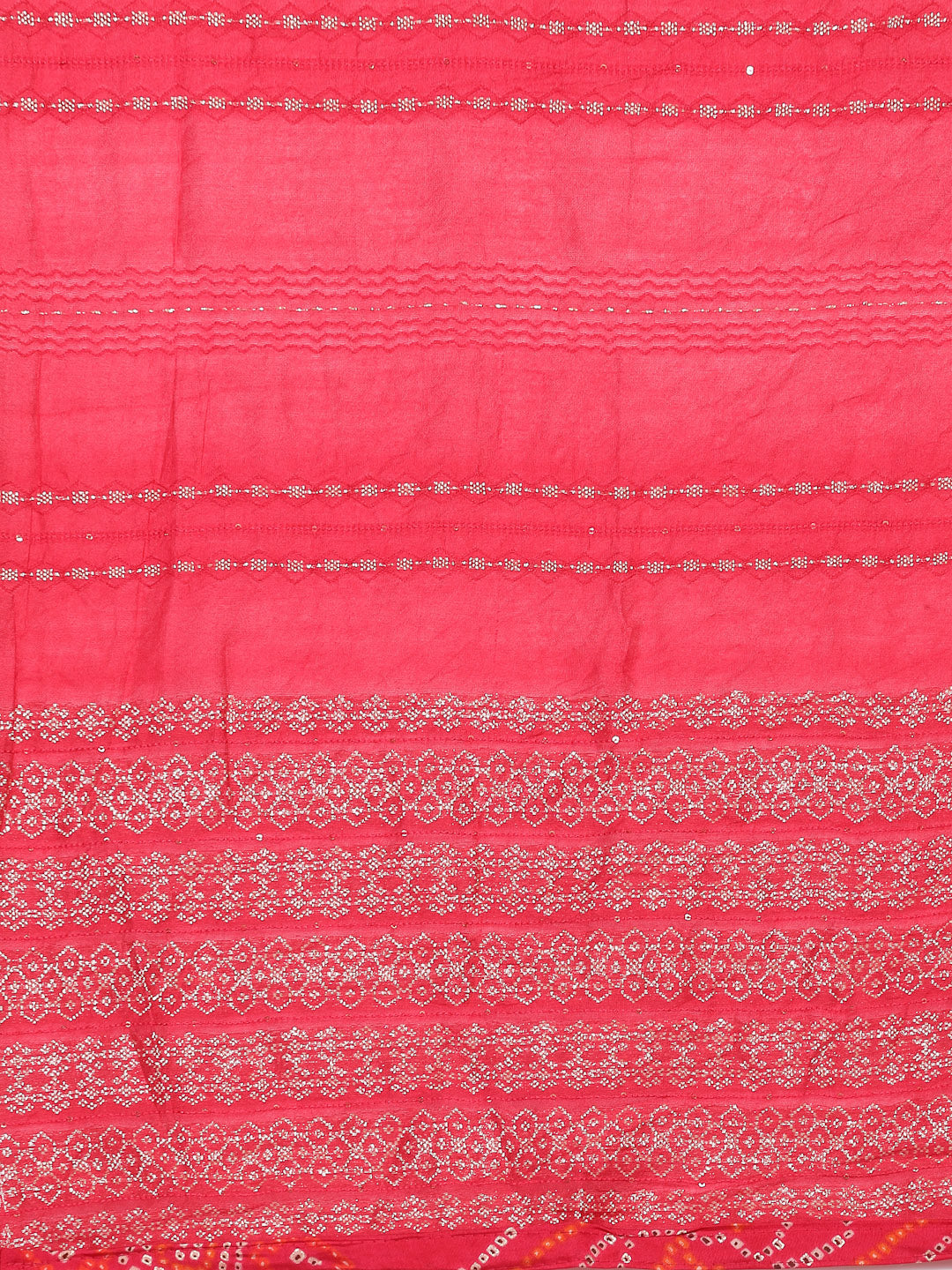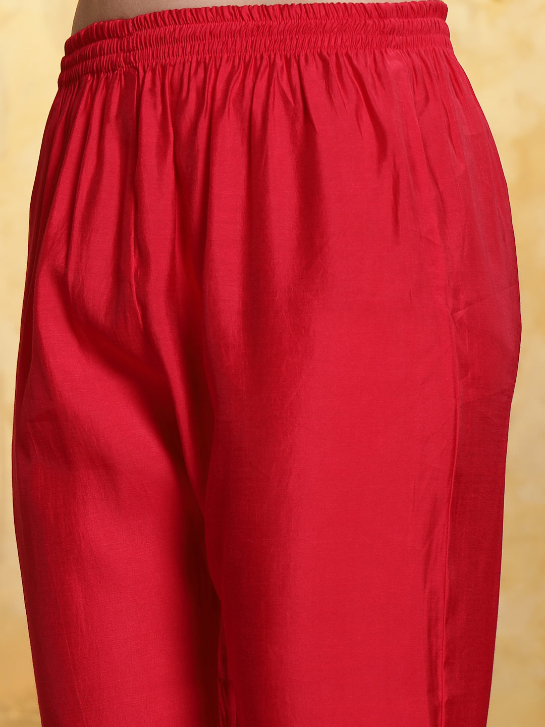 Festive Red Bandhani printed silk blend straight Kurta Pant set. Kurta has embroidery on V- Neck and 3/4th Sleeves and with embroidered border. Silk blend banarasi dupatta with lace on both side. Kurta Length - 45" inch, Pant Length - 38" Inch, Dupatta Length - 2.25 Mtr.