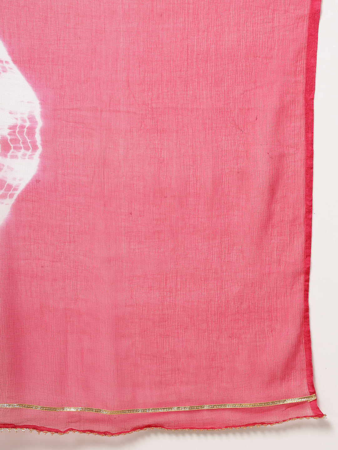 Pink bandhej printed rayon alia cut kurta with sequence lace detailing on neck, soild pant which has full elasticated waistband and printed chiffon dupatta. Product's Kurta Length - 45" Inch, Palazzo Length - 38" Inch, Dupatta Length - 2.30 Mtr.