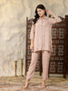 Blush colored embroidered co-ord set in rayon fabric. Top has shirt collar. Sleeves are long and has button closer. Top length -30'' Inch, and Pant length -38" Inch.