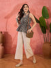 Black floral printed cotton sleeveless short top and cotton blend lurex pant set. Top has v-neck and shoulder tie-ups. Flared lurex pant has front belt and back elasticated waistband. Pair it with smart footwear and sling to enhance the look. Products Length- 25'' Inch, trouser length- 38''.