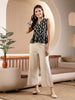 Black ikat printed rayon sleeveless short top and cotton blend lurex pant set. Top has v-neck with front button placket. Flared lurex pant has front belt and back elasticated waistband. Products Length- 22'' Inch, trouser length- 38''.Â