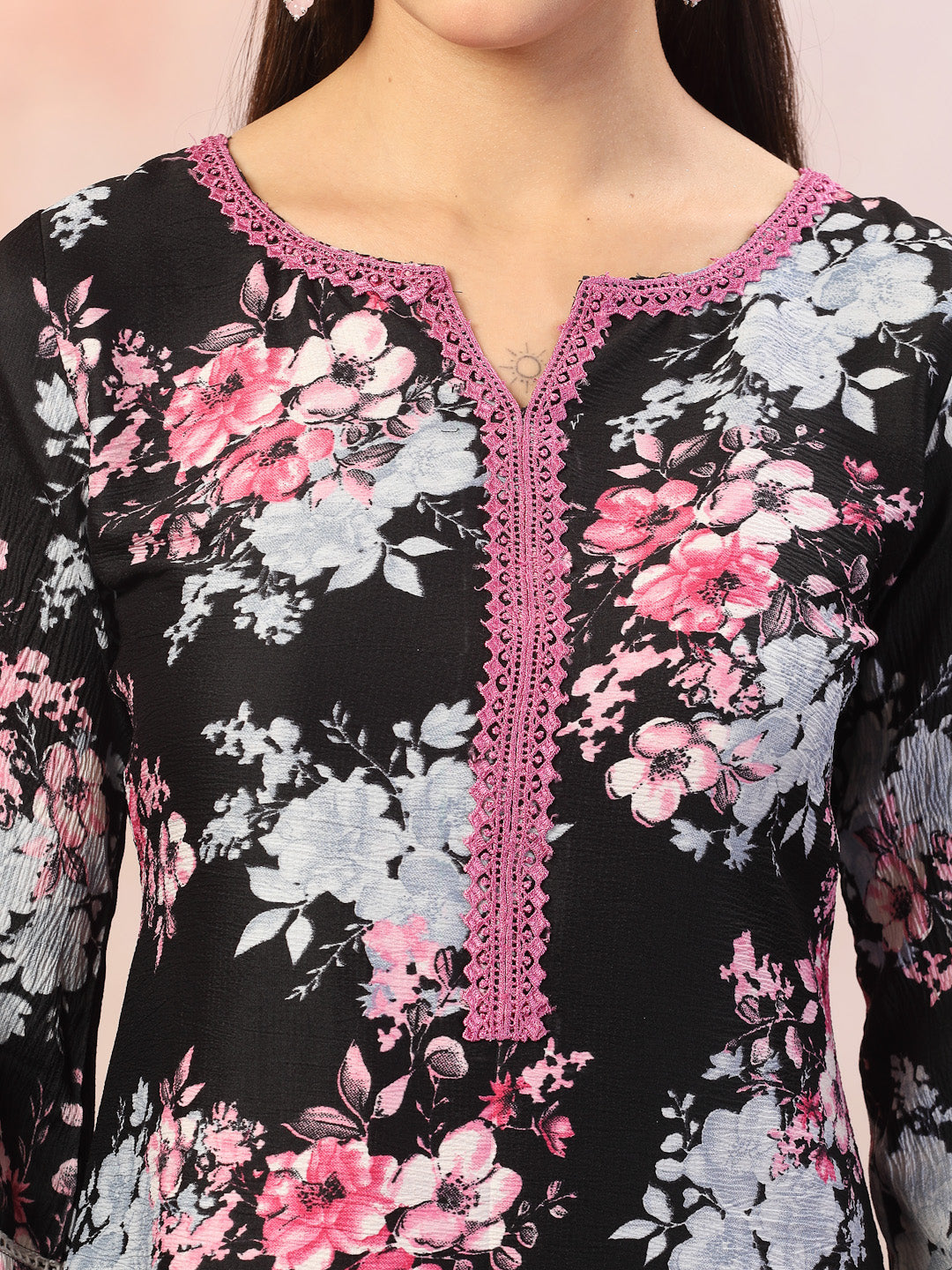 Black soild kurta pant dupatta set in Italian crush fabric. Kurta has colourfull floral print. Colourfull laces on bottom and pant. Pant is fully elasticated. Paired with lace detailed fancy fabric dupatta. Kurta Length- 45" Inch, Pant Length - 38'' Inch, Dupatta Length - 2.30 Mtr.